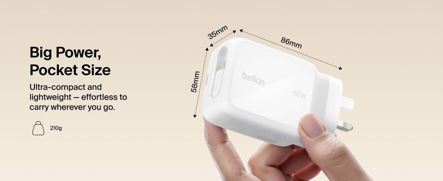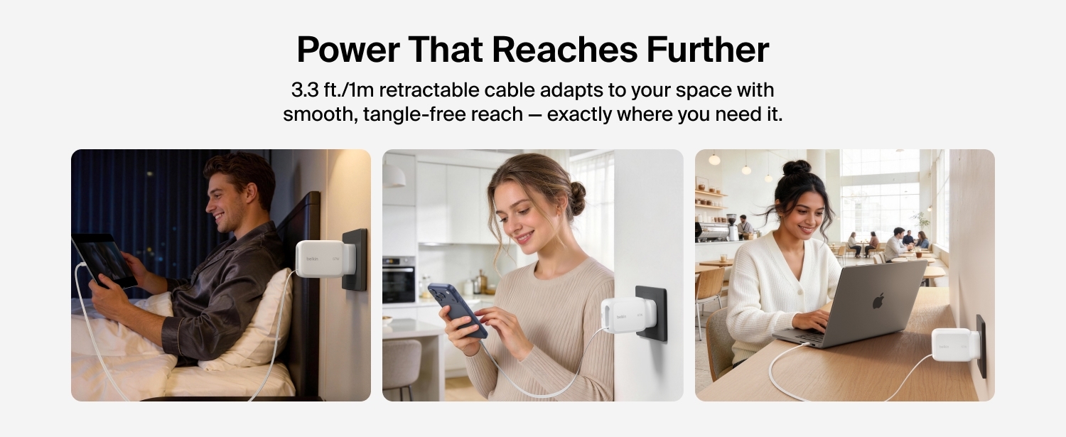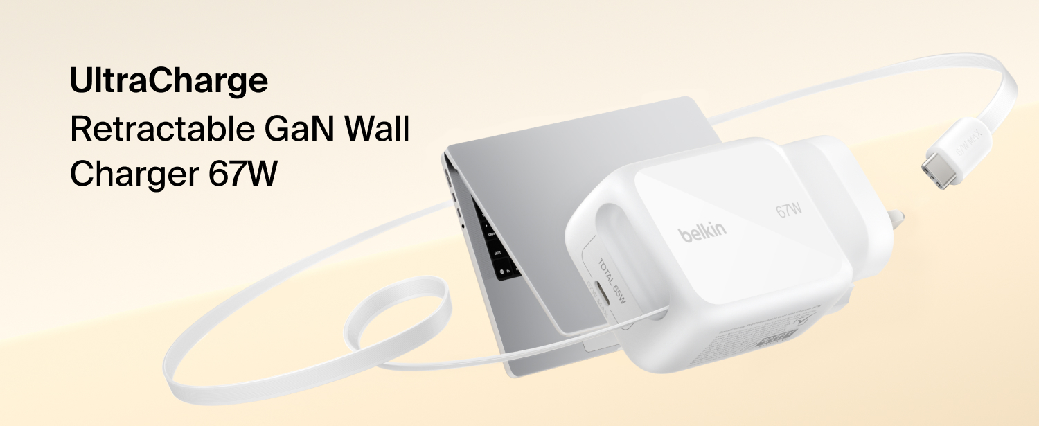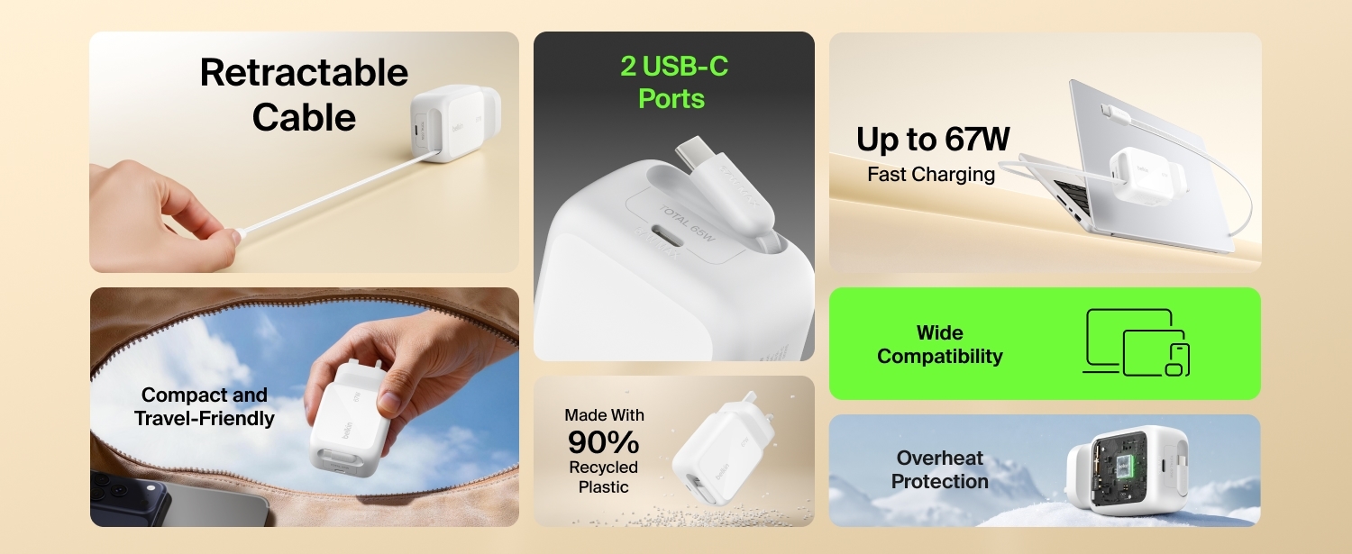 這款配備伸縮線的便攜式 GaN 充電器,讓外出使用更輕鬆,特別適合工作人士與經常外出的使用者。提供高達 67W 的快速充電,同時為兩部裝置充電,是您的旅行良伴。具備摺疊式插頭、USB-C 伸縮線和 USB-C 埠,一個充電器即可為手機、手提電腦、平板電腦、耳機和 Apple Watch 充電,滿足所有充電需求。