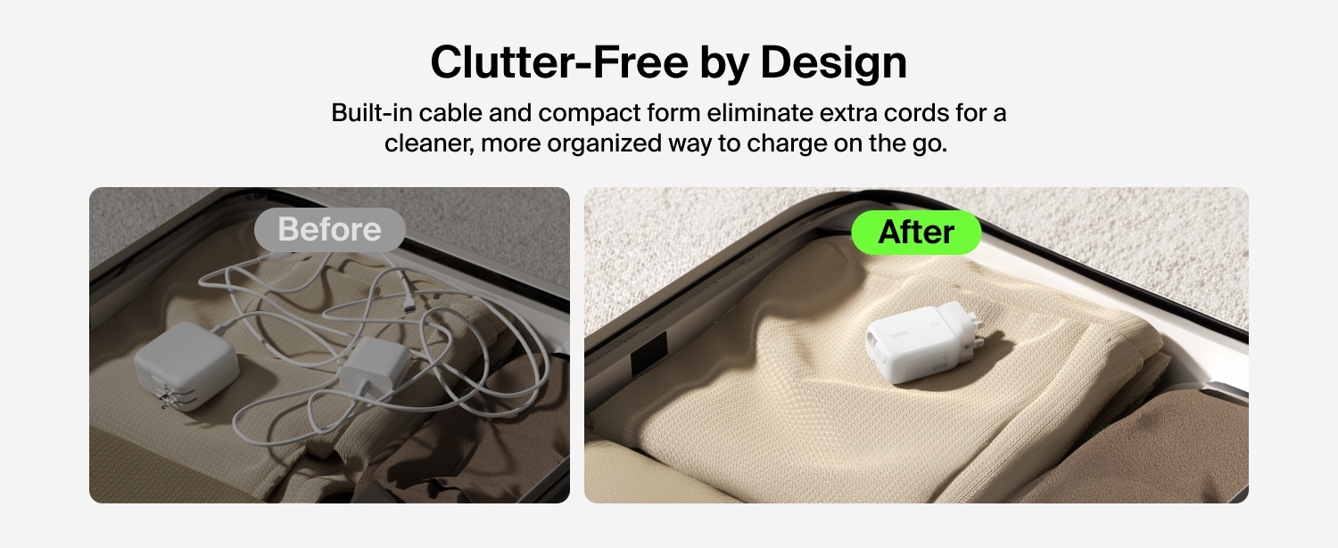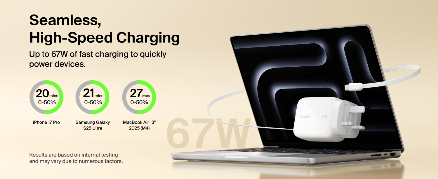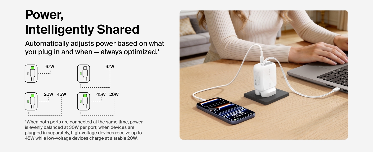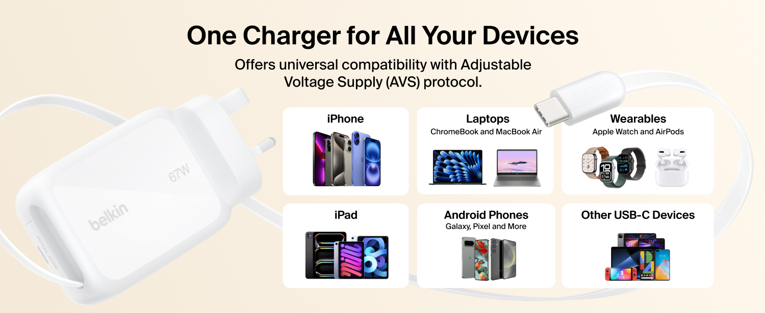 這款配備伸縮線的便攜式 GaN 充電器,讓外出使用更輕鬆,特別適合工作人士與經常外出的使用者。提供高達 67W 的快速充電,同時為兩部裝置充電,是您的旅行良伴。具備摺疊式插頭、USB-C 伸縮線和 USB-C 埠,一個充電器即可為手機、手提電腦、平板電腦、耳機和 Apple Watch 充電,滿足所有充電需求。