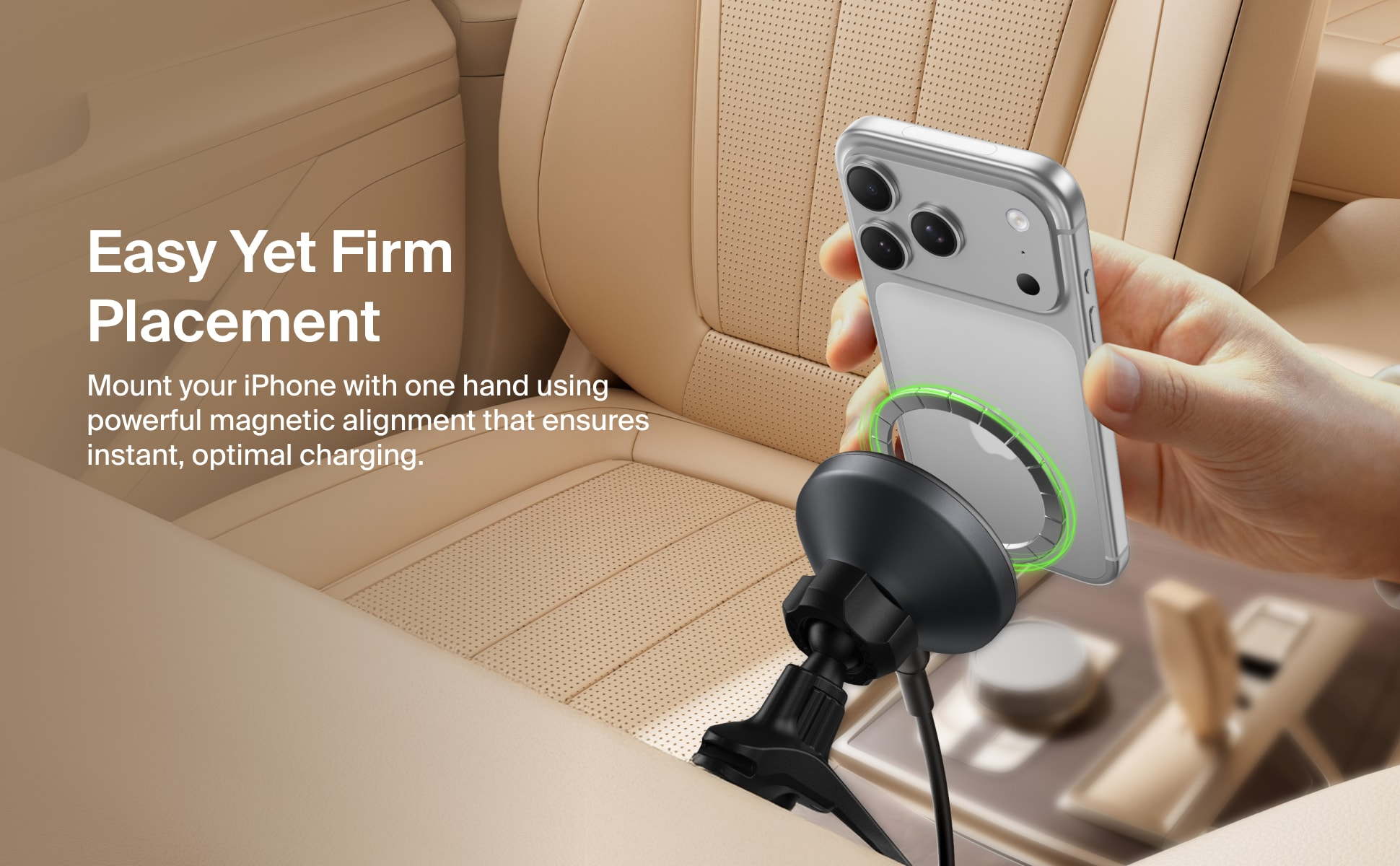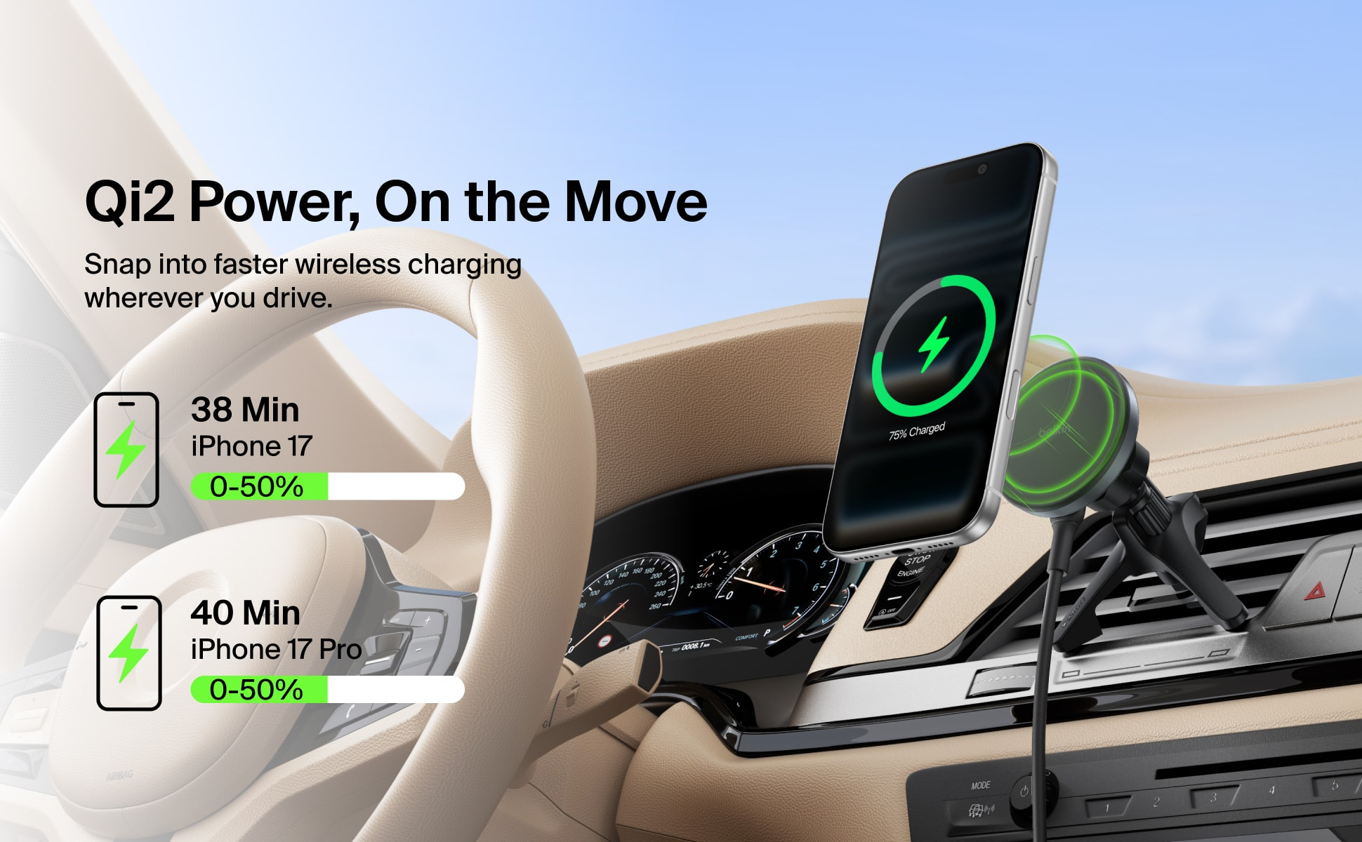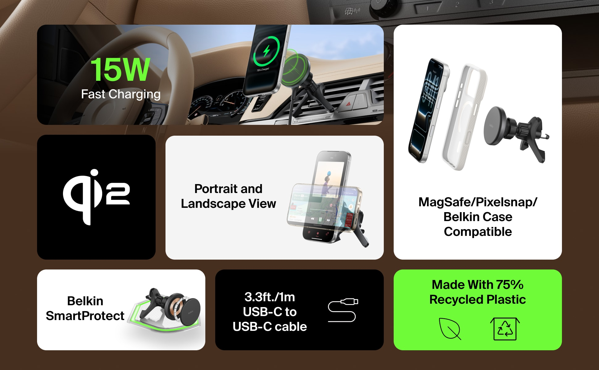 不論長途或短程,這款 Qi2 無線充電器都是您的行車快充戰友,提供高達 15W 的充電效能。這款安全穩固支架結合強勁磁吸技術,為手機提供緊密支撐,橫放或直擺模式隨心切換,讓您路途無憂。隨附 USB-C 轉 USB-C 連接線,插上即可使用,並能輕鬆固定於大部分車款的通風口上。