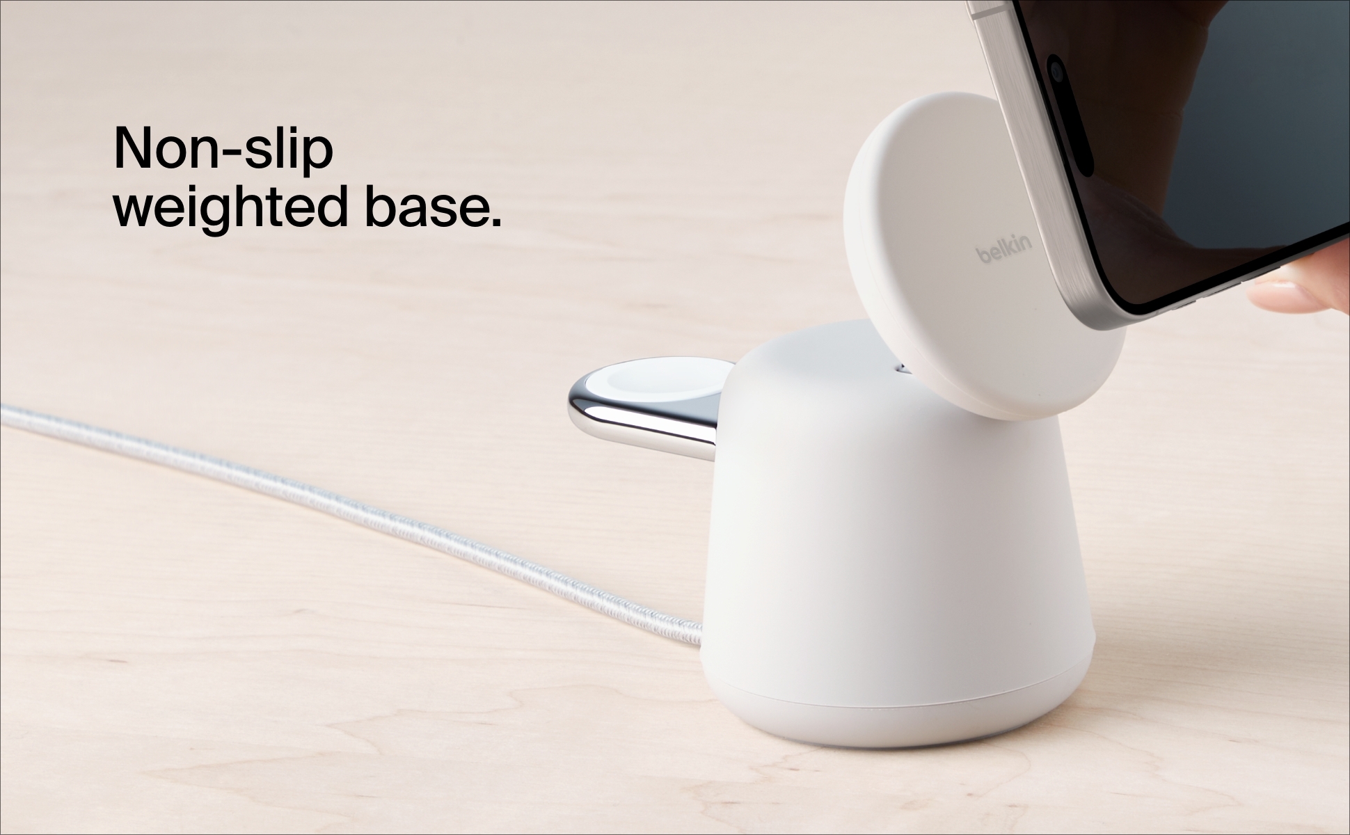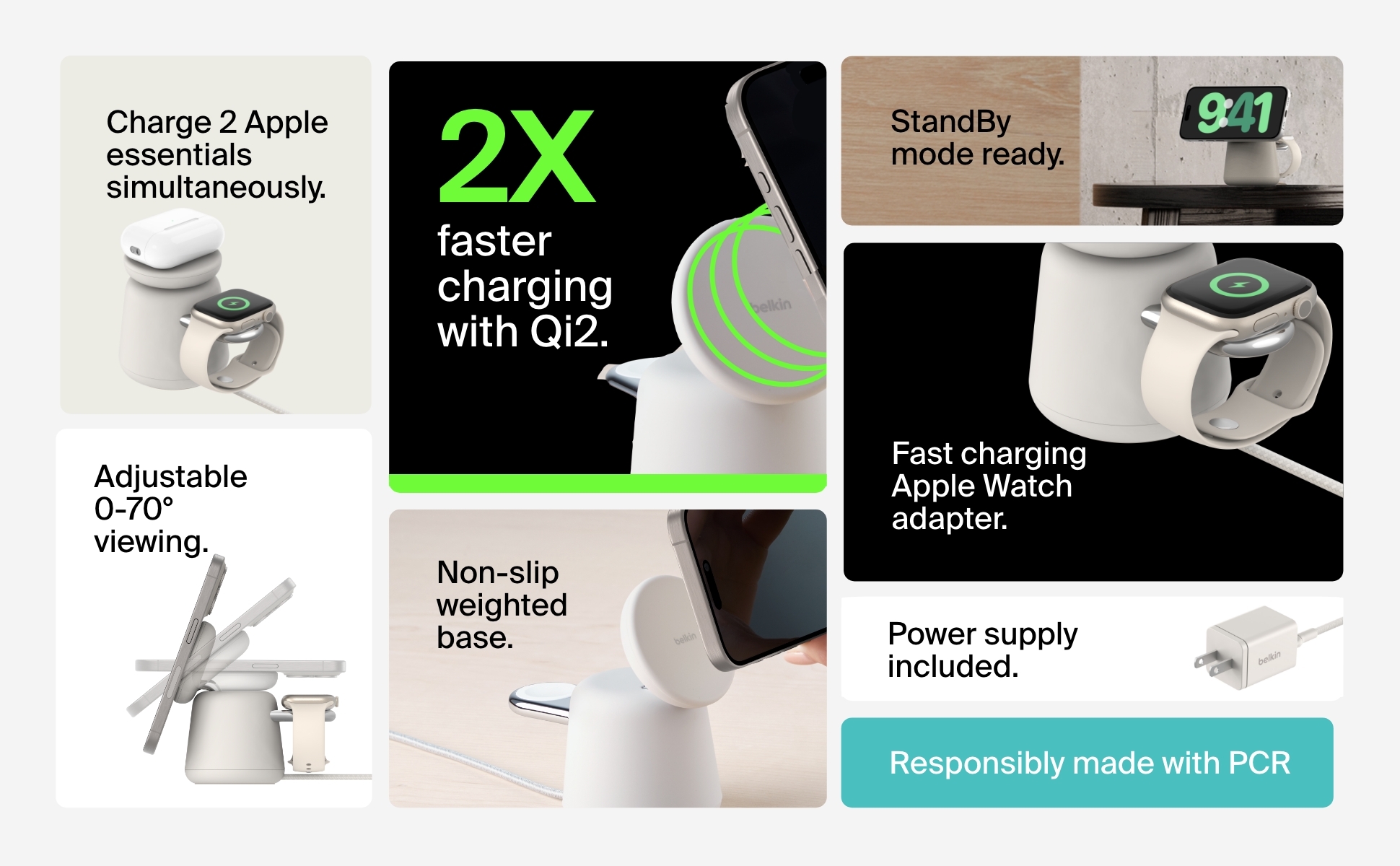 採用最新 Qi2 技術,這款充電座可為 iPhone 12 及後續機型、Apple Watch 4 及後續機型,以及多款 AirPods 提供 15W 高效無線快充。磁吸貼合技術確保穩固連接,速度更提升至標準無線充電器的兩倍†,並支援 StandBy 模式,靈活切換橫放與直擺模式,滿足多種場景需求。