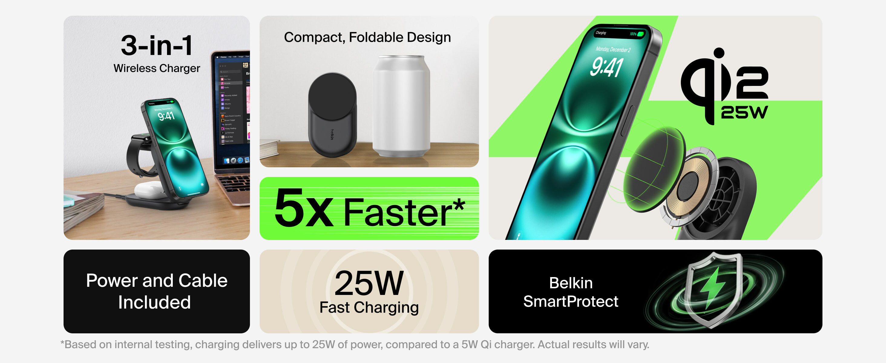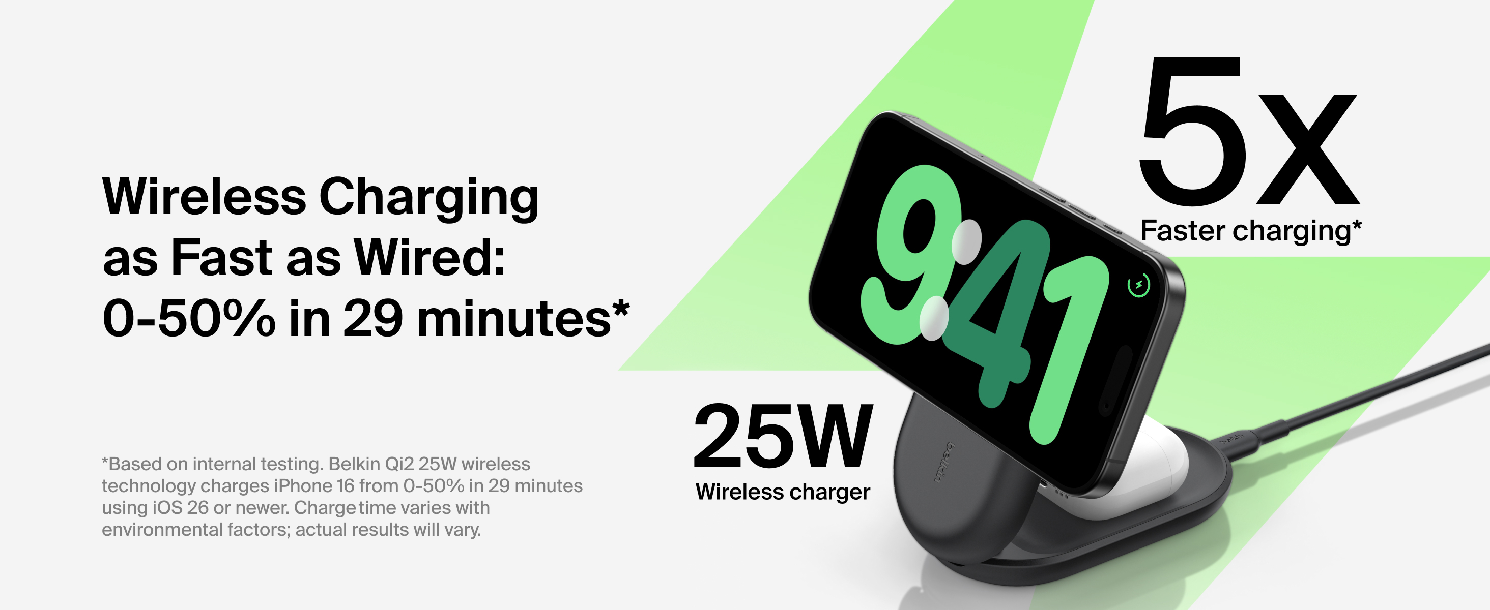 根據內部測試,Belkin Qi2 25W 無線充電技術可在 29 分鐘內將搭載 iOS 26 或更新版本的 iPhone 16 從 0% 充電至 50%。充電時間視乎環境因素而有所不同,實際結果可能有差異。