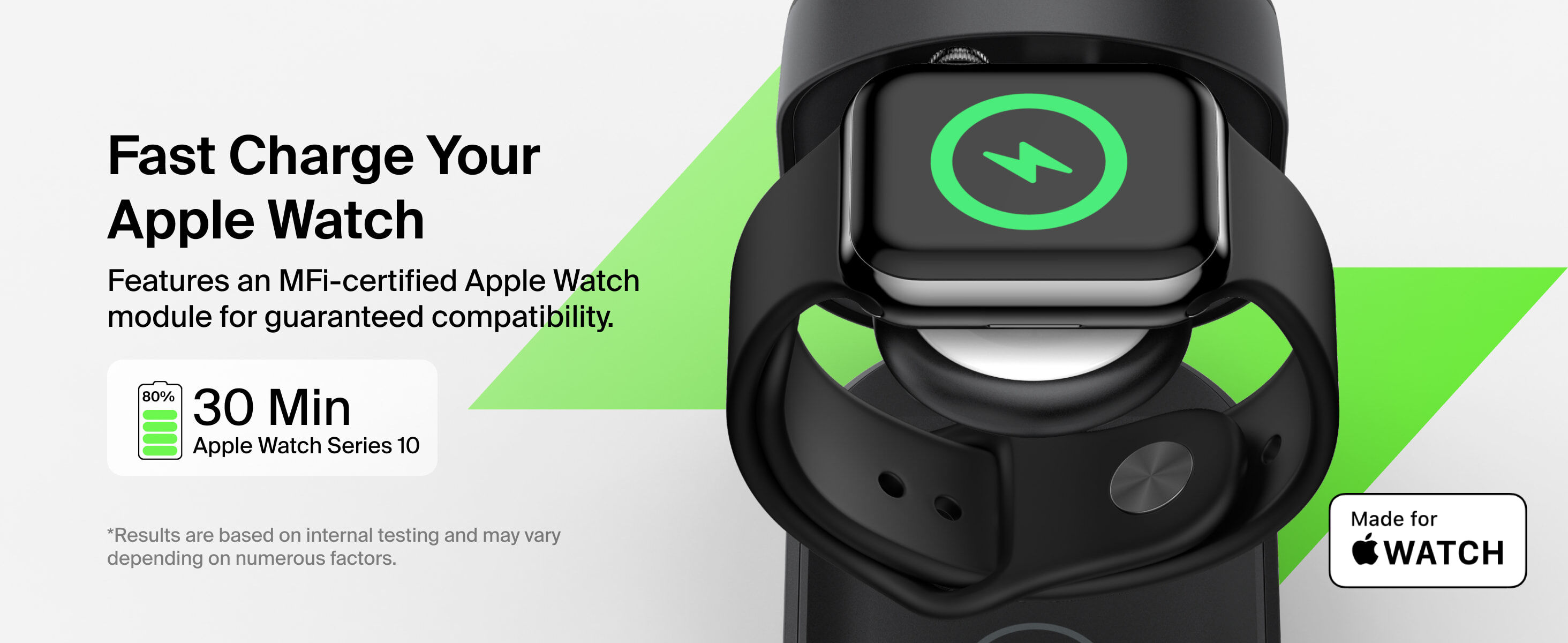 只需 29 分鐘,即可將 iPhone 從 0% 充電至 50%‡,這款可摺疊的輕巧充電器適合在家中使用與隨身攜帶。搭載 ChillBoost™ 被動冷卻散熱技術††,可同時為三部裝置 (iPhone、AirPods 或 Apple Watch) 提供安全的快充體驗。