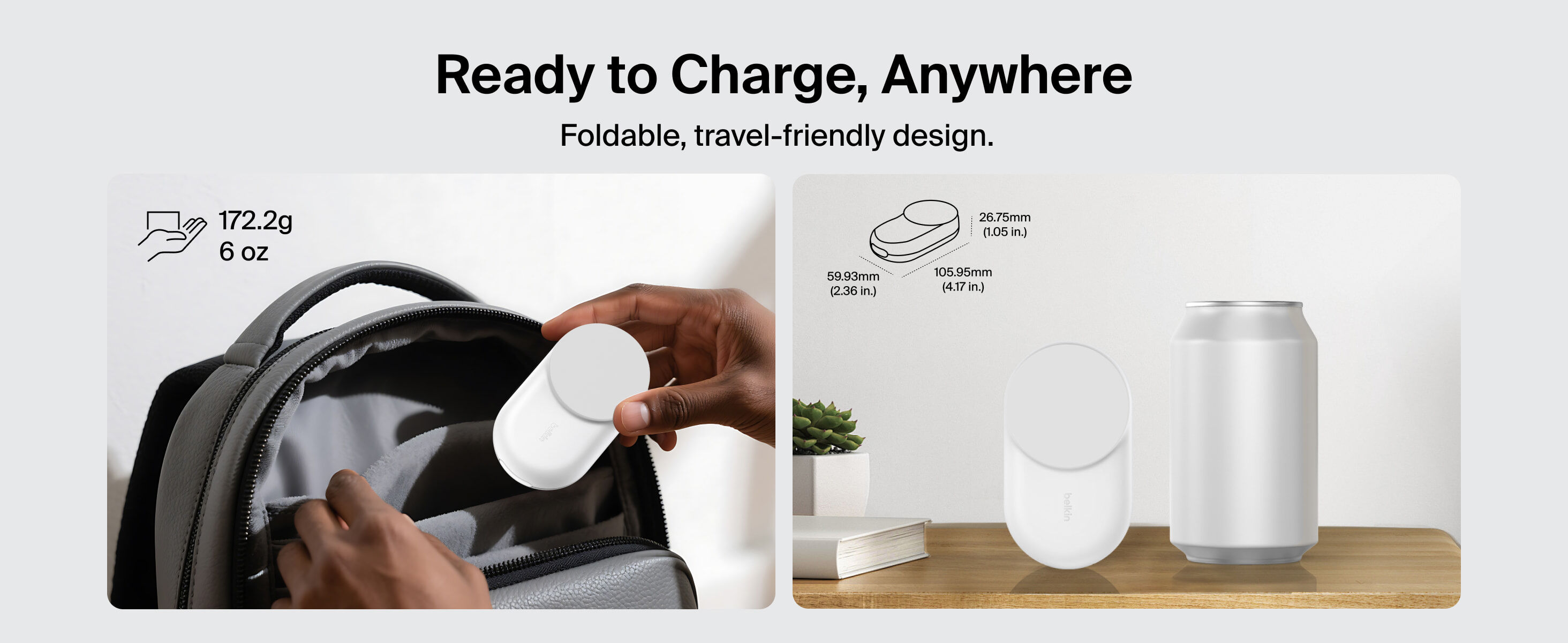 • 摺疊設計方便攜帶,輕巧便於隨身使用,隨時隨地都能將任何平面變成充電站