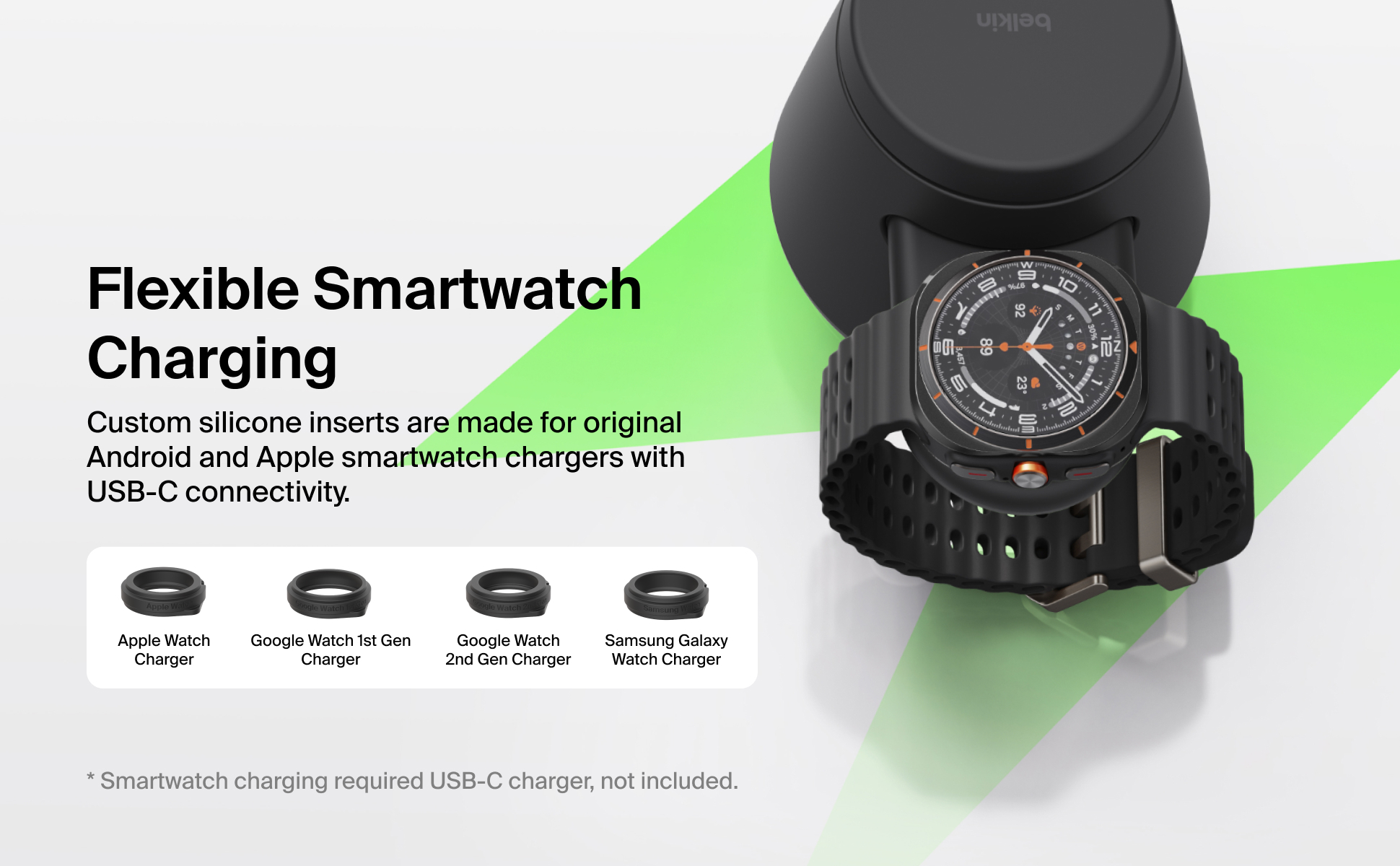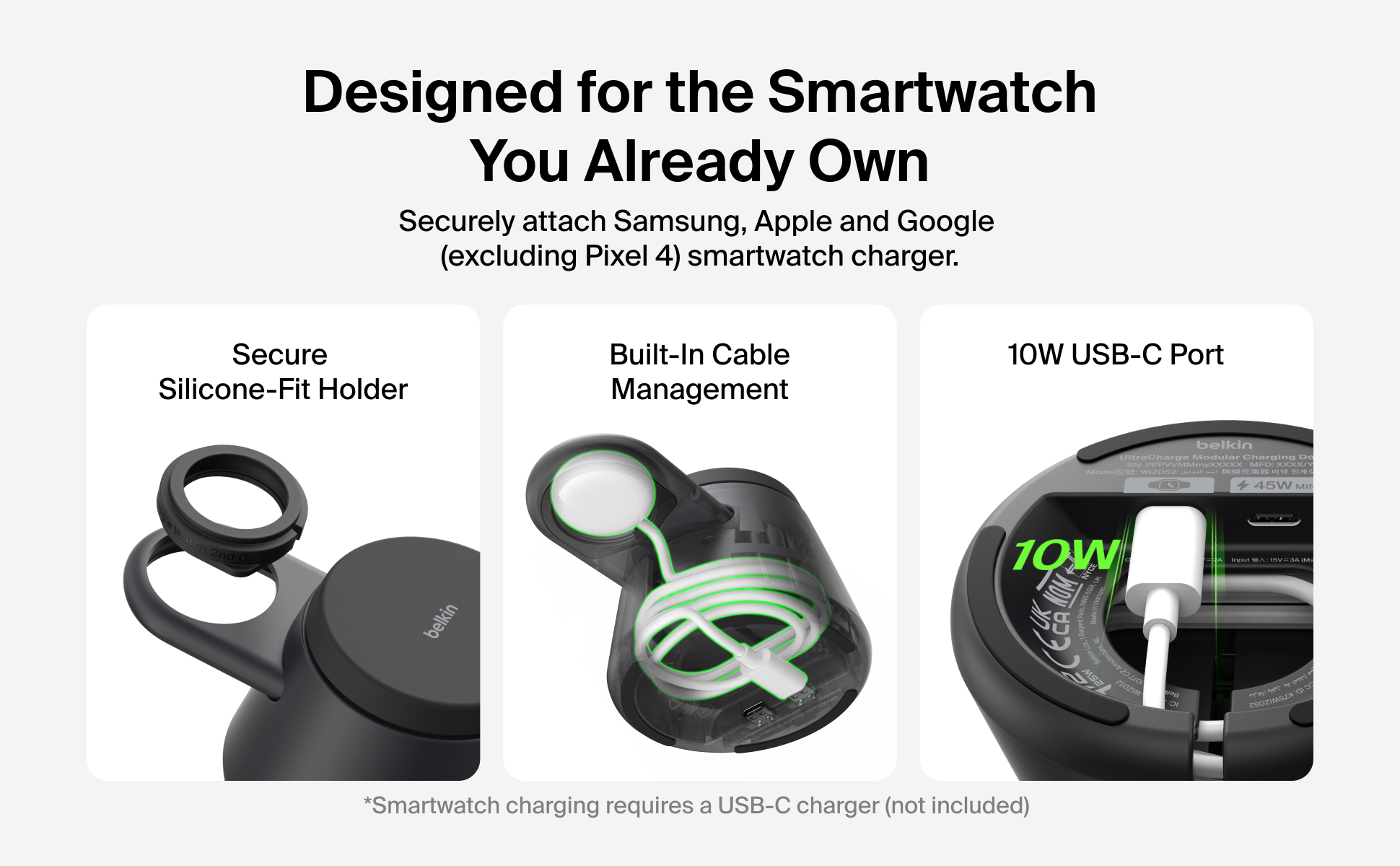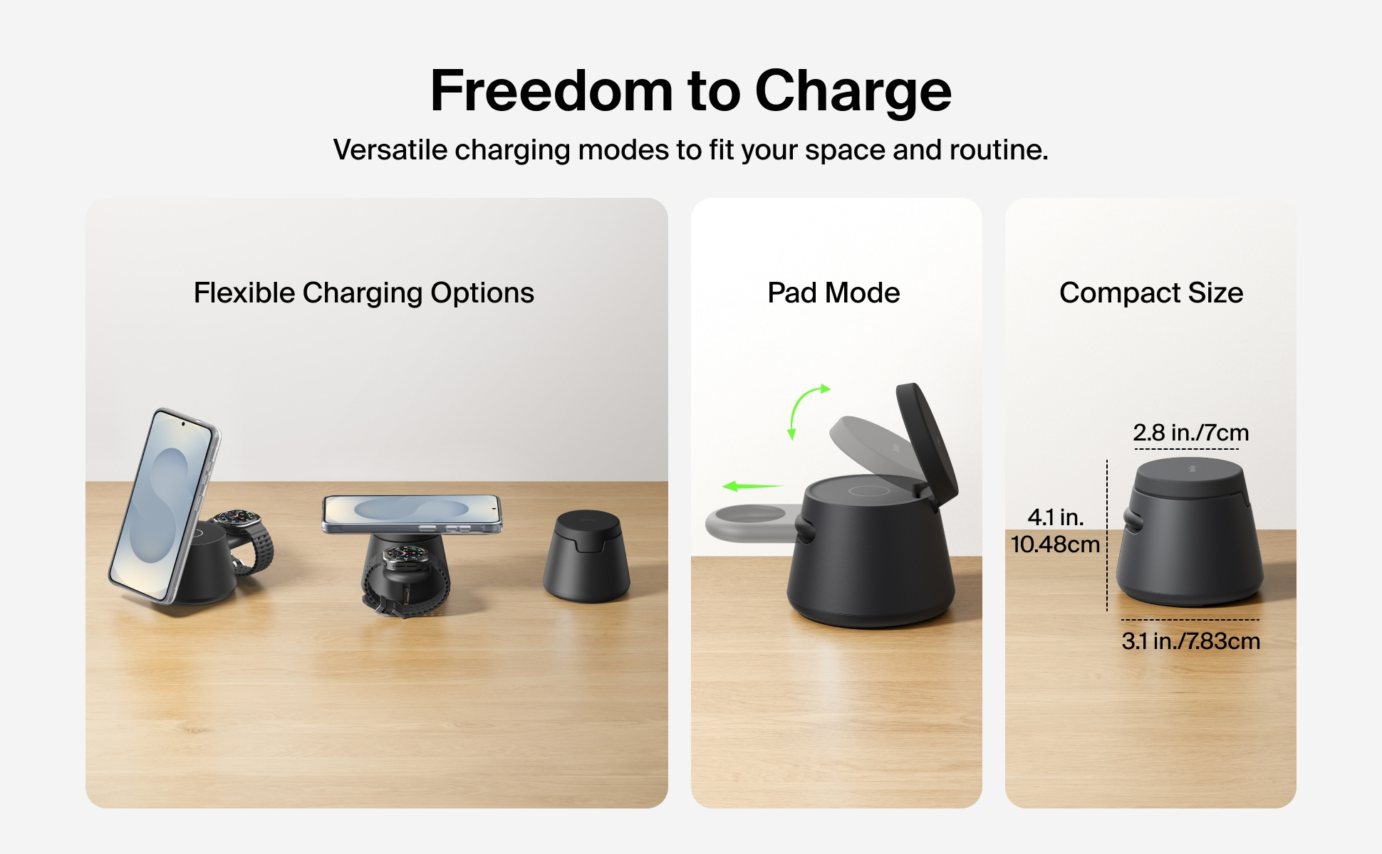 使用這款無縫高效的模組充電座,為 3 部裝置同時充電。雙無線充電板能為手機與耳機補電,而內建伸縮式的智能手錶支架則可搭配 Samsung、Google 和 Apple 的原廠智能手錶充電器 (不隨附) 使用。