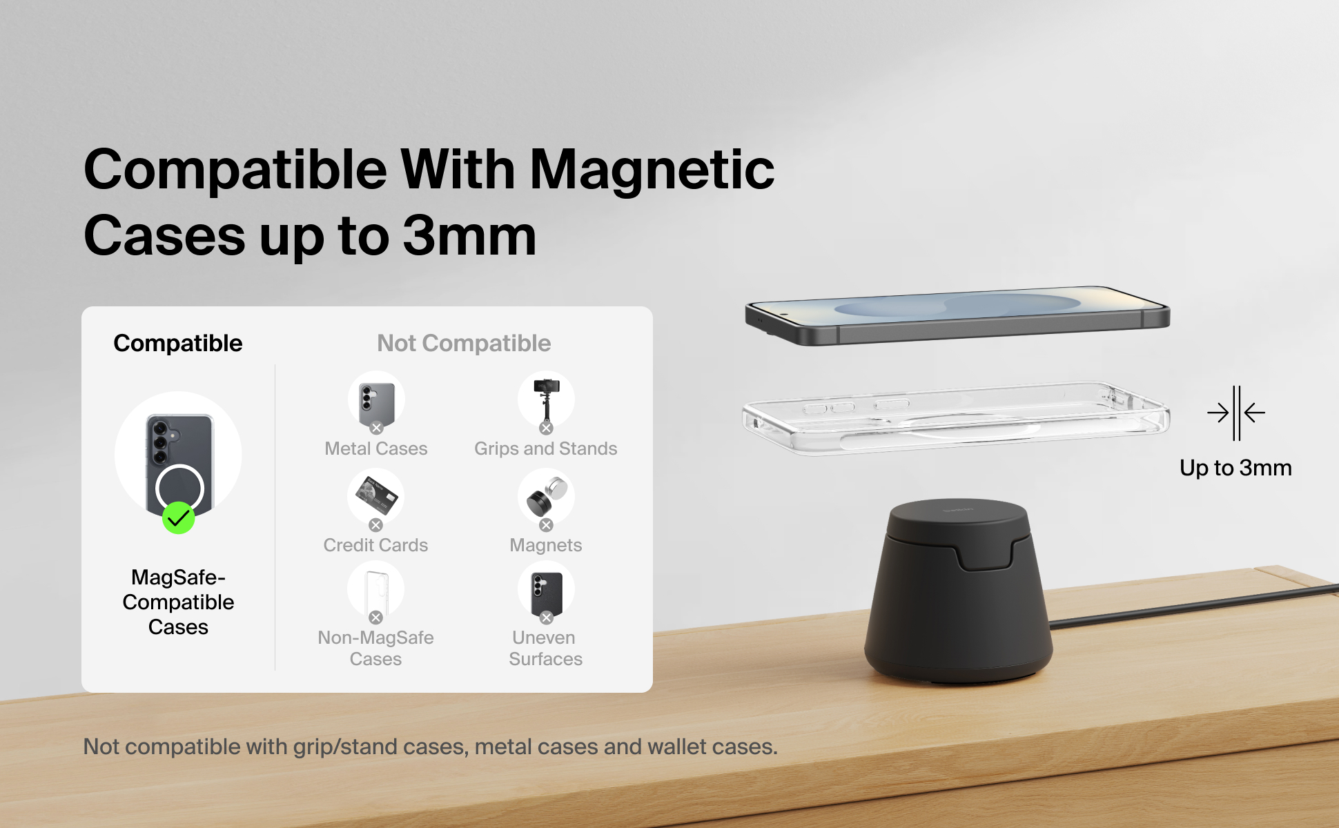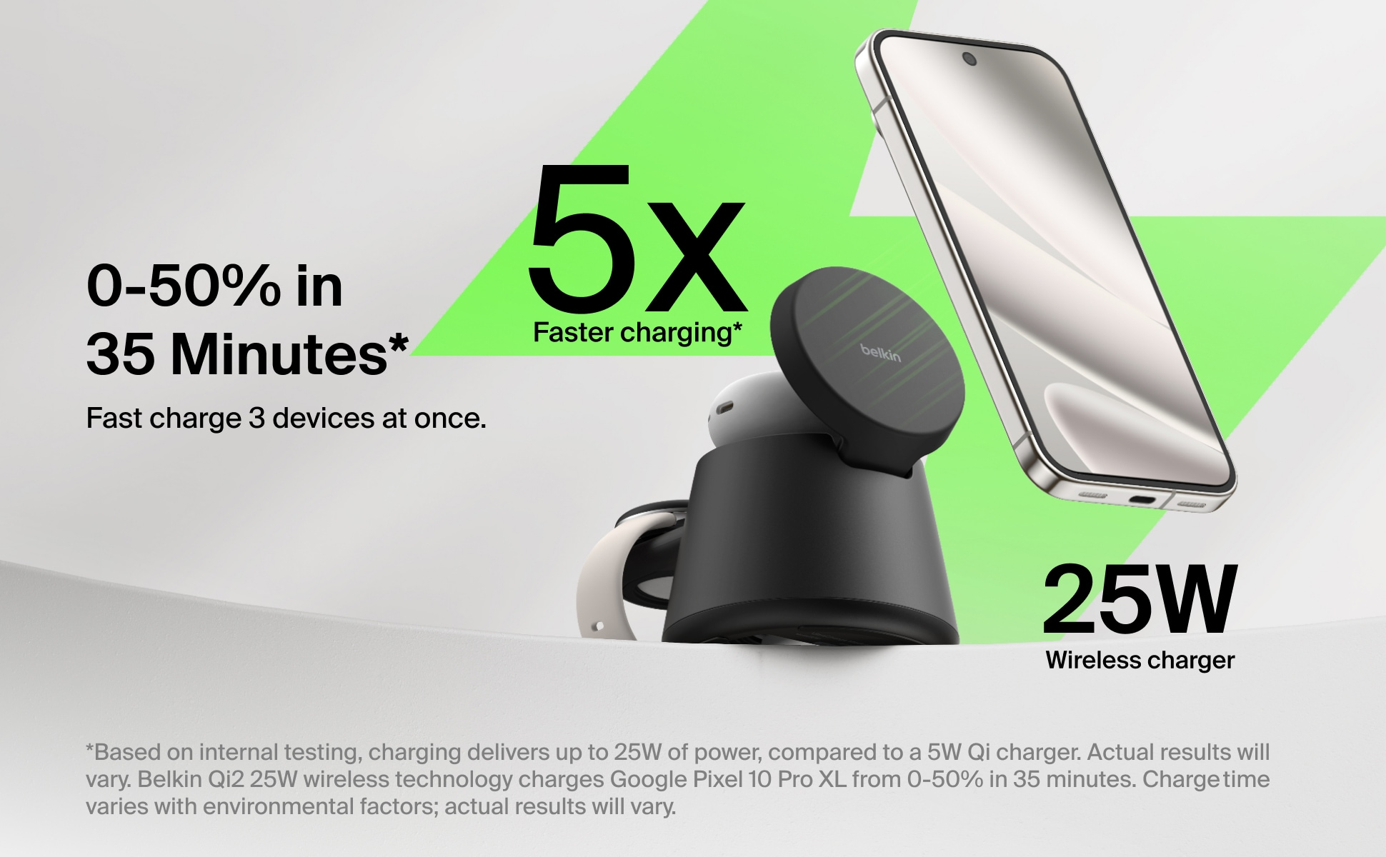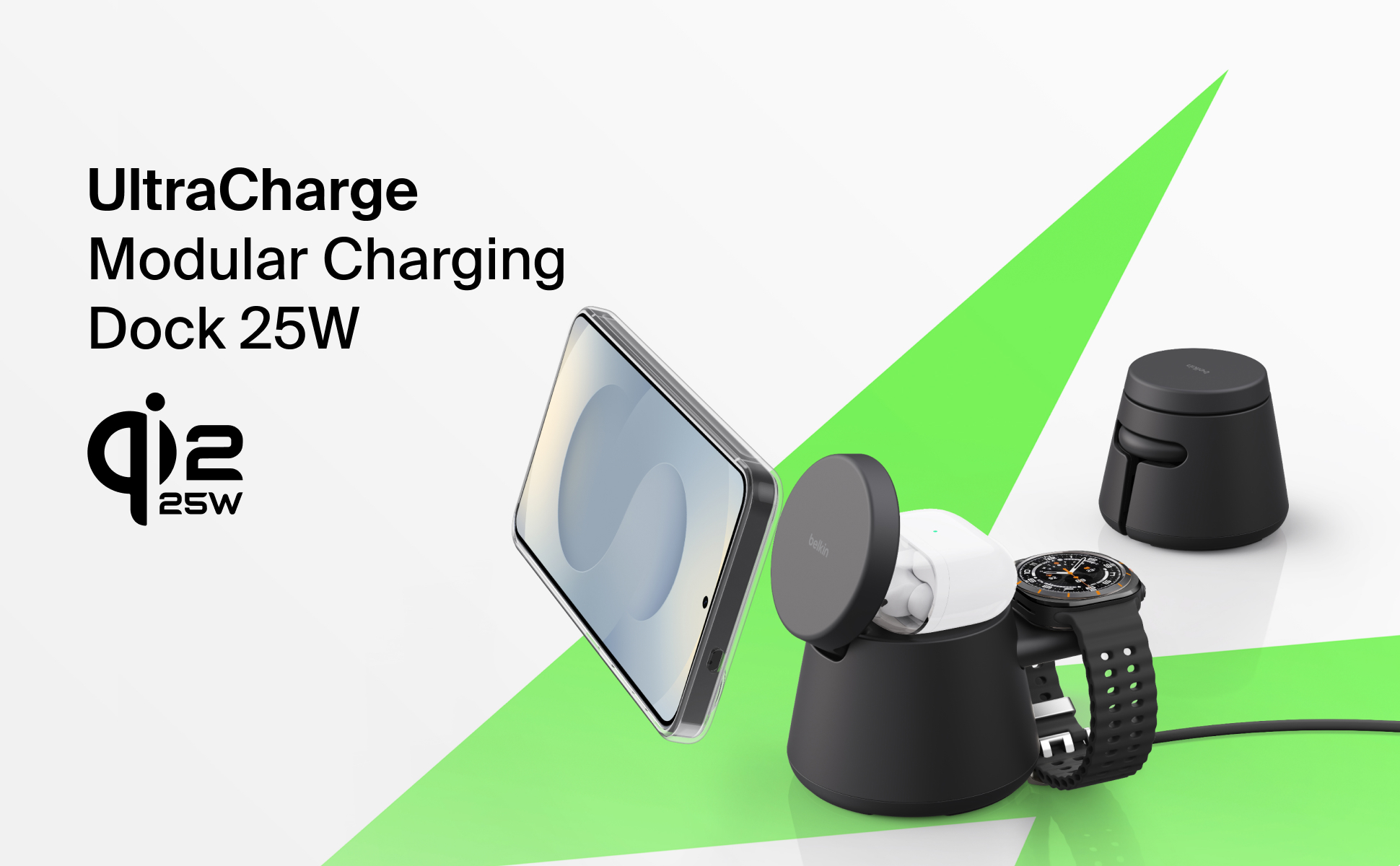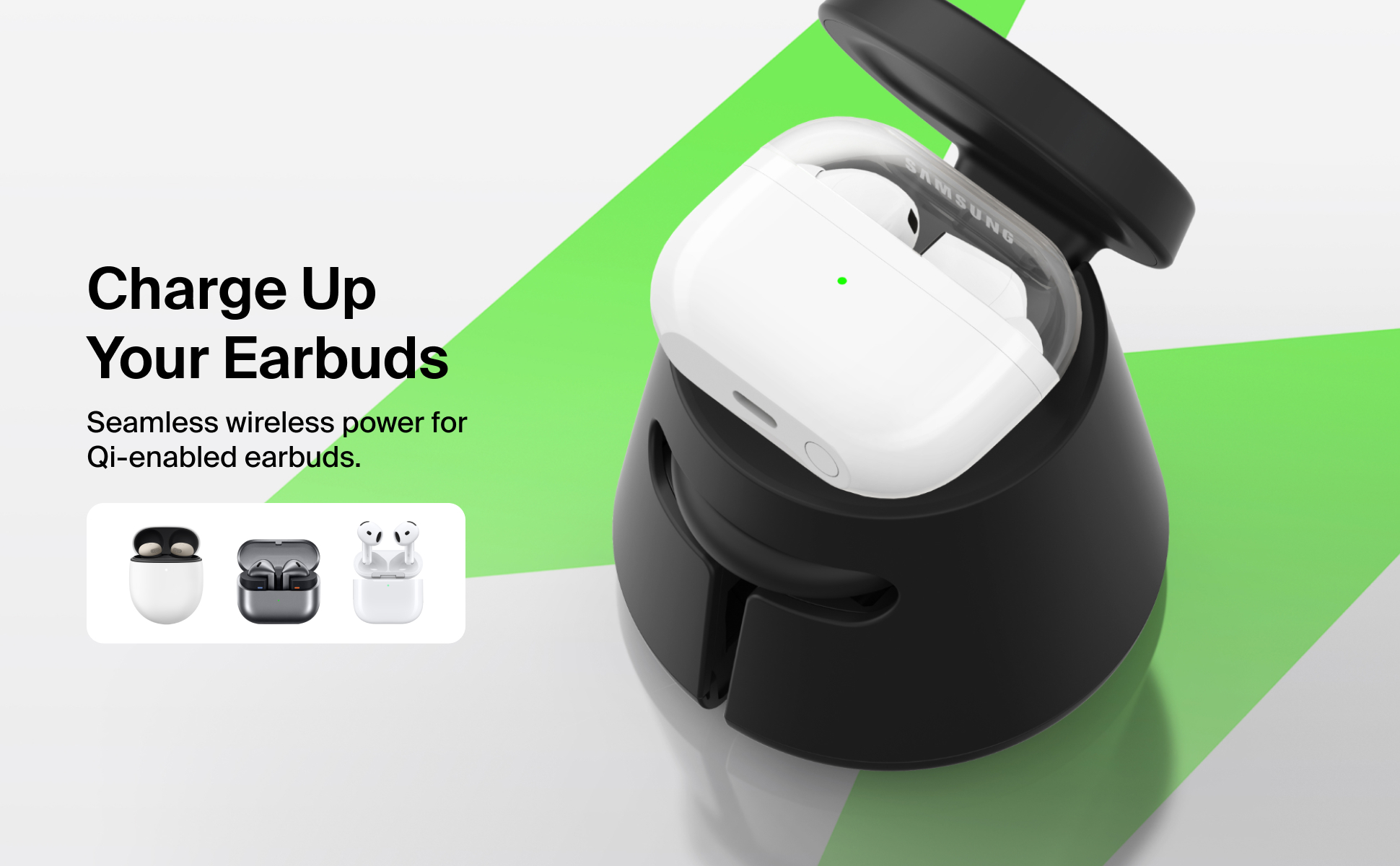 使用這款無縫高效的模組充電座,為 3 部裝置同時充電。雙無線充電板能為手機與耳機補電,而內建伸縮式的智能手錶支架則可搭配 Samsung、Google 和 Apple 的原廠智能手錶充電器 (不隨附) 使用。