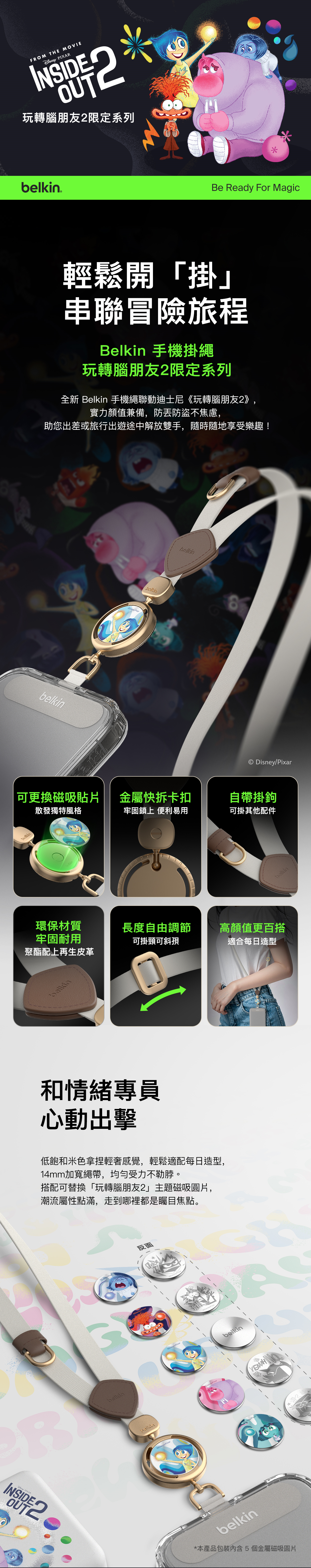 全新迪士尼系列多功能手機背帶,首創獨特扣環設計,可以隨意更換角色磁吸片,自行定義專用的肩帶,解放雙手同時秀出自我風格。