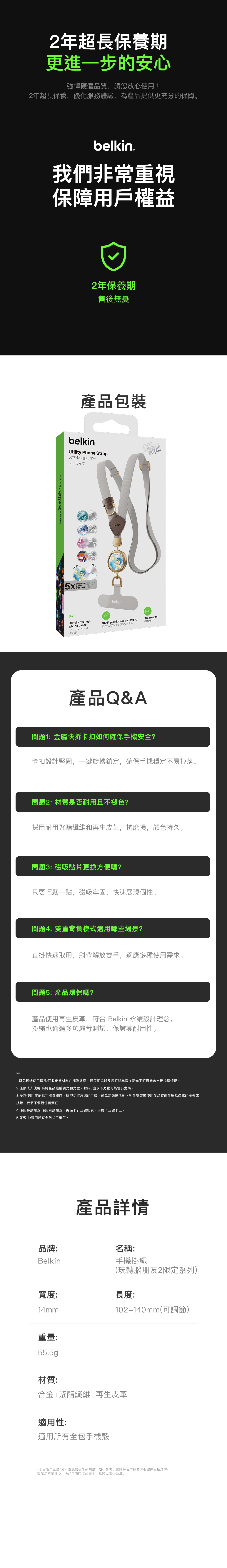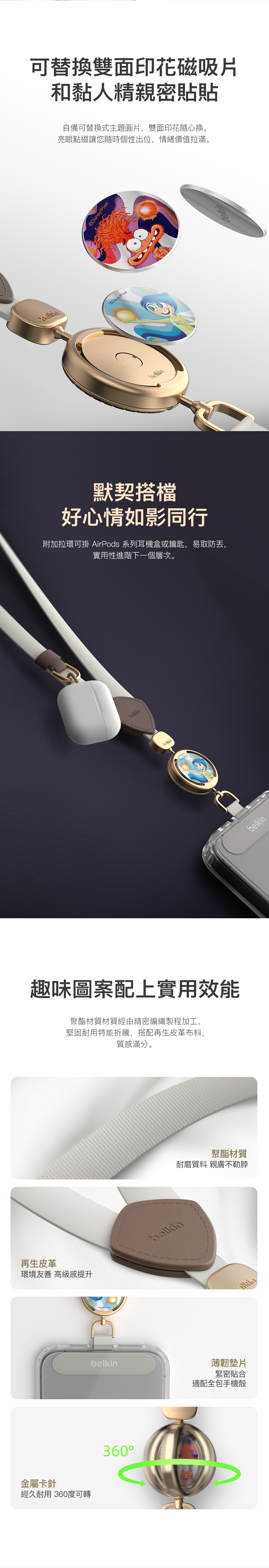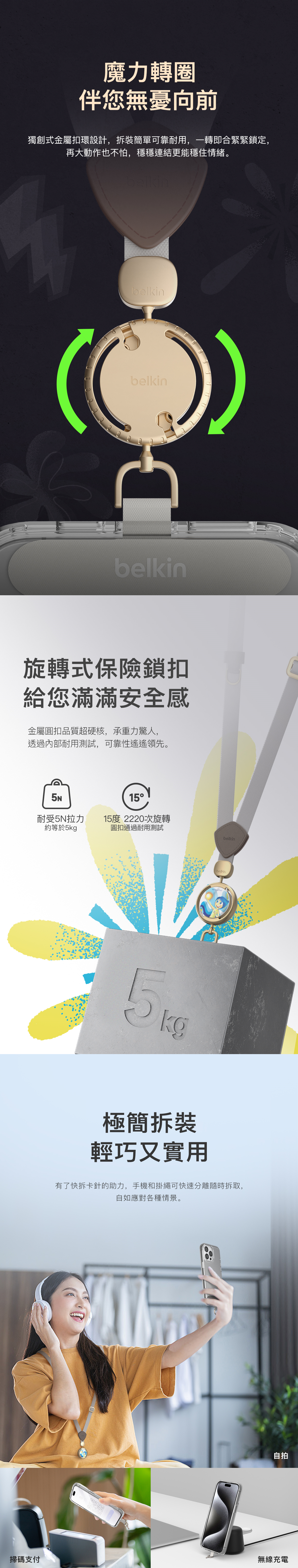 • 獨創專利:Belkin首款手機掛繩,配備自動旋轉快拆扣,可安全固定您的手機。