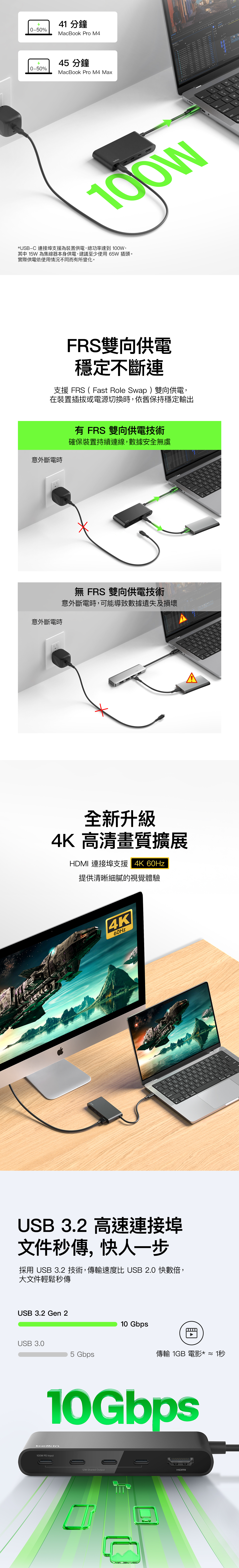 此集線器適用於專業內容製作者與辦公人士,透過 USB-C 連接埠擴展至最多五項裝置,包含高解析度顯示器、硬碟和網絡攝影機。HDMI 最高可支援 4K@60Hz 顯示器,傳輸速度比 USB3.0 快 2 倍,並為主裝置提供 100W Power Delivery。無論在家中、辦公室內或外出時,都是理想的集線器選擇。