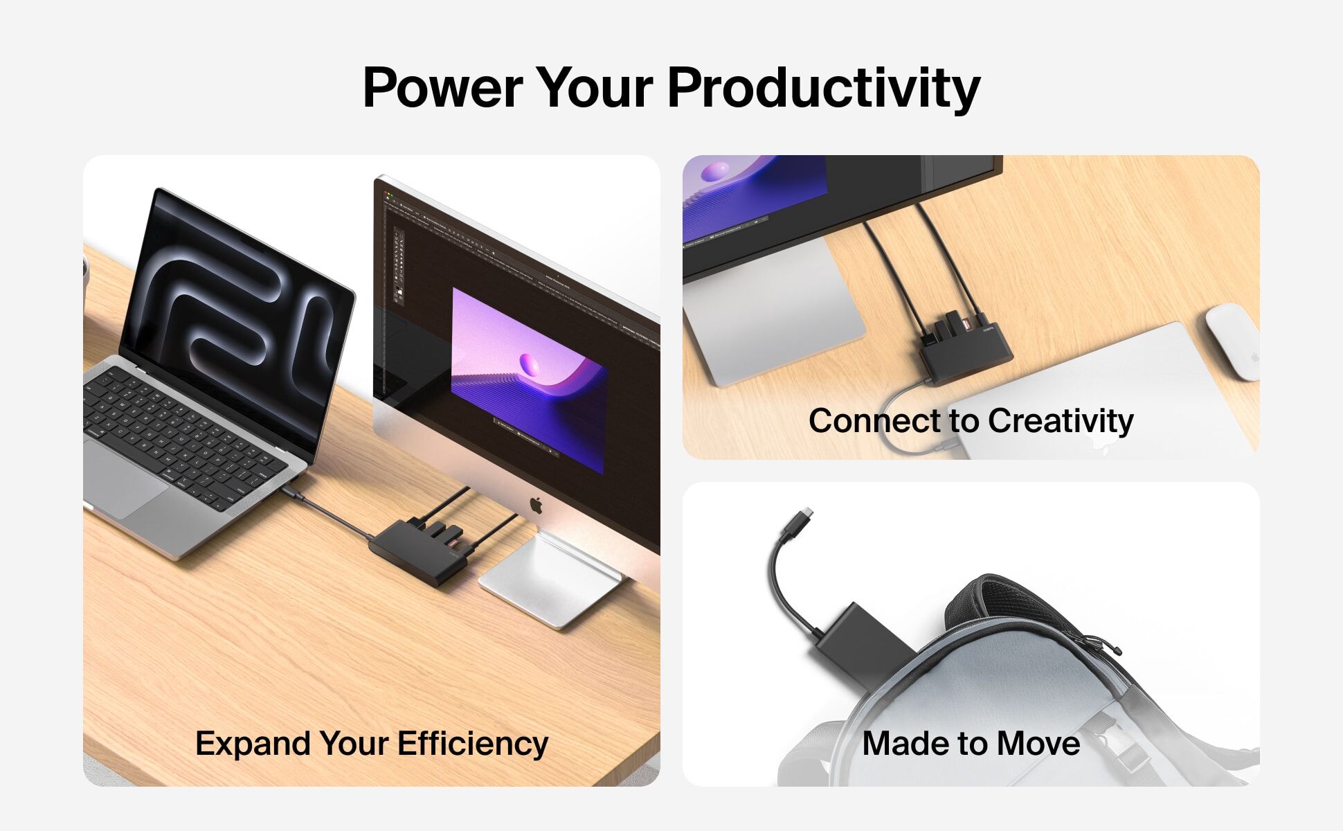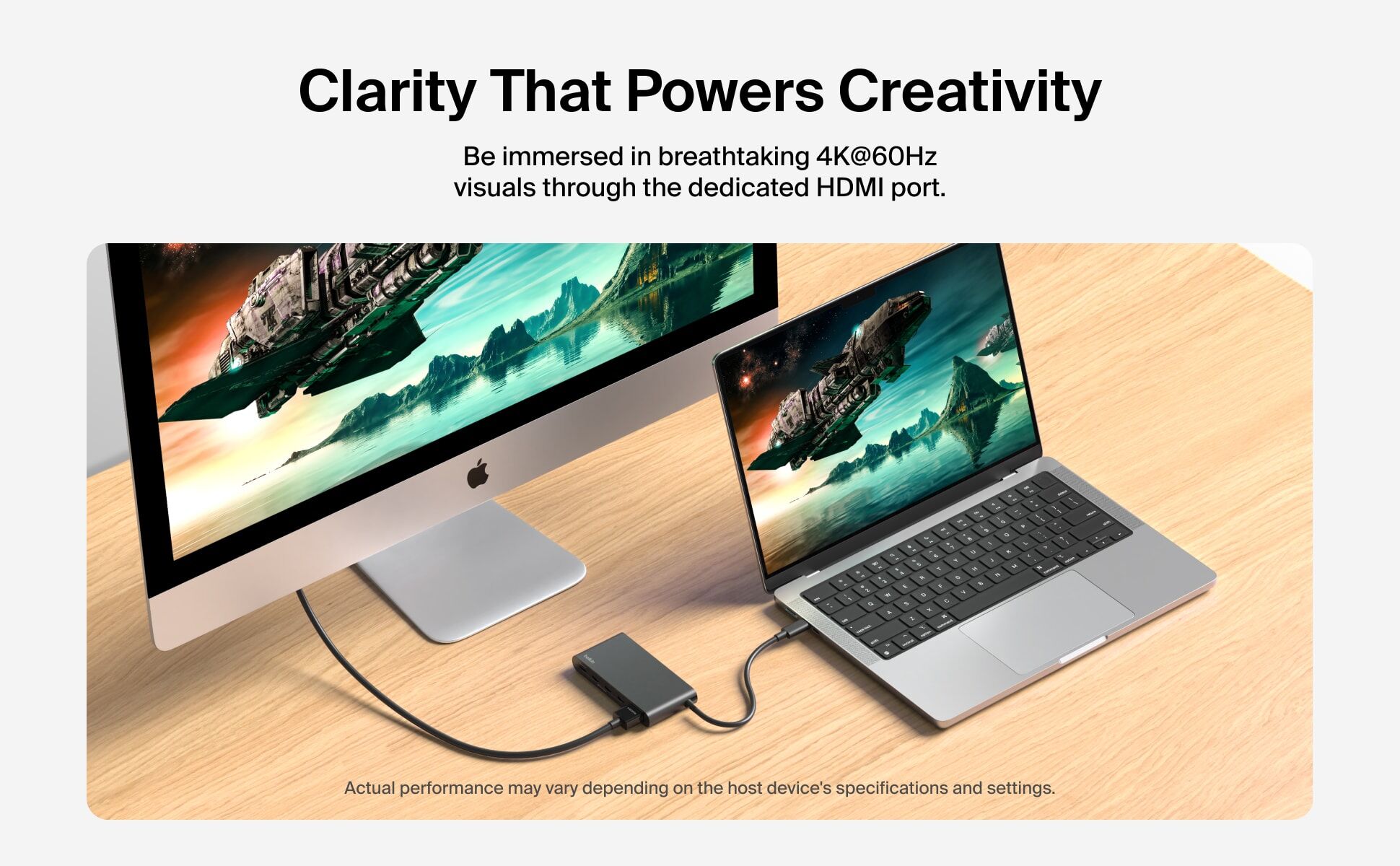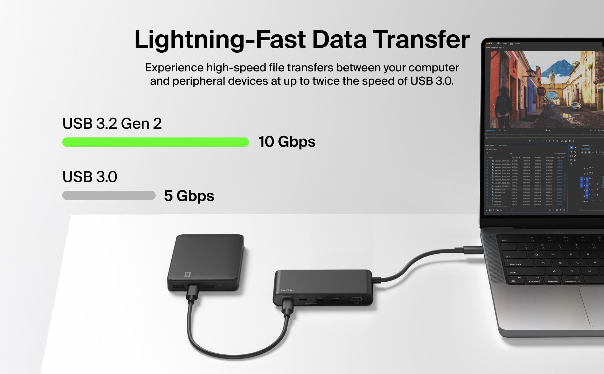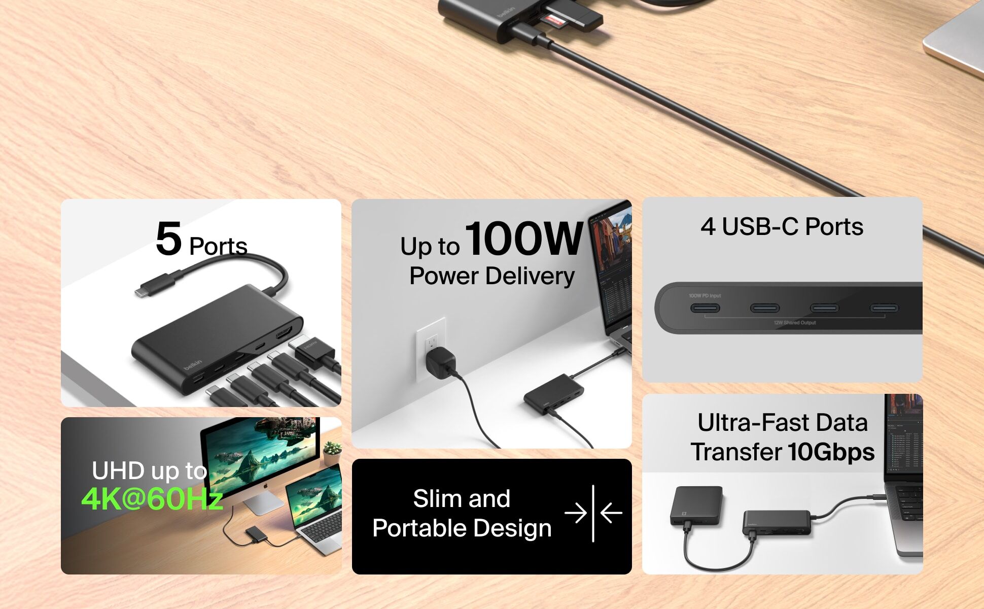 這款集線器適用於專業內容製作者與辦公人士,透過 USB-C 連接埠擴展至最多五項裝置,包含高解析度顯示器、硬碟和網絡攝影機。HDMI 最高可支援 4K@60Hz 顯示器,傳輸速度比 USB3.0 快 2 倍,並為主裝置提供 100W Power Delivery。無論在家中、辦公室內或外出時,都是理想的集線器選擇。