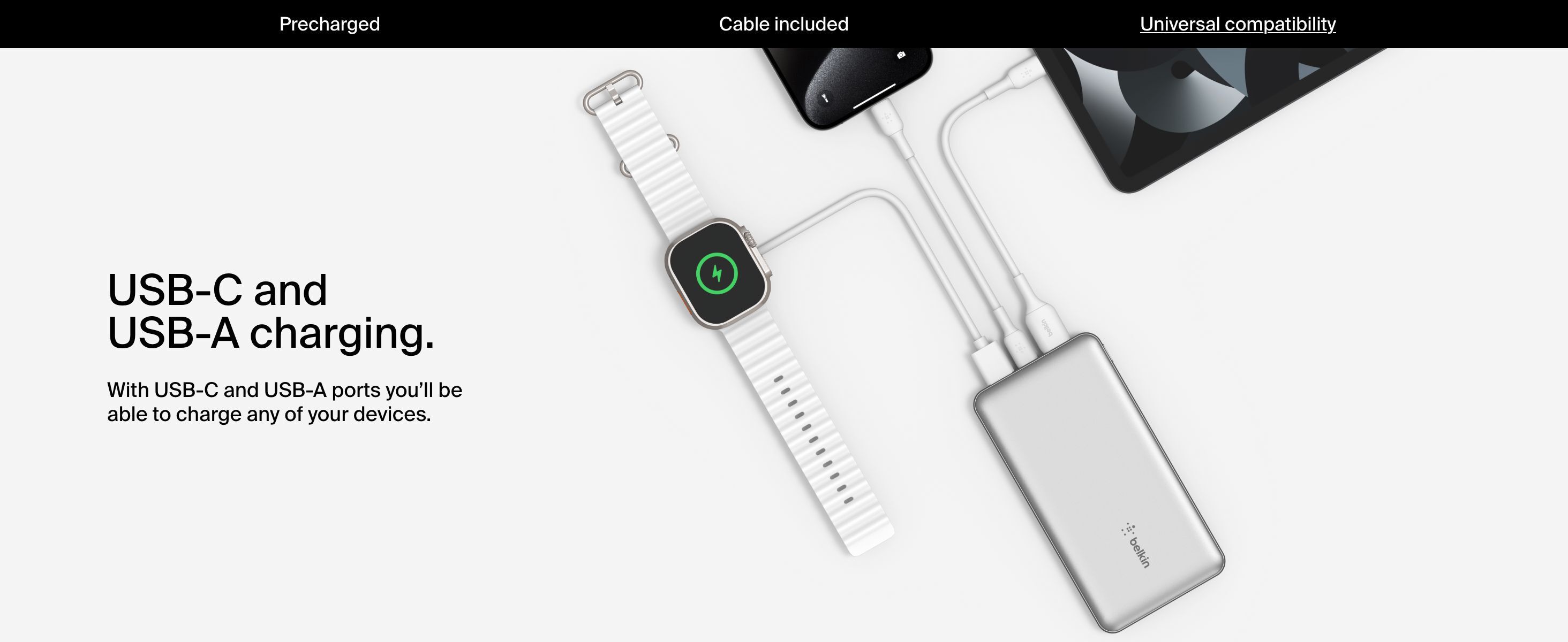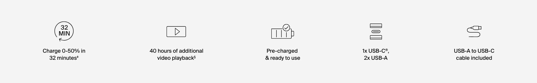 盡情觀看電影、撥打 FaceTime 電話,並保持導航應用程式運作至目的地。 隨附的 USB-A 轉 USB-C 連接線讓您開箱即可開始充電,並在需要時為行動電源充電。