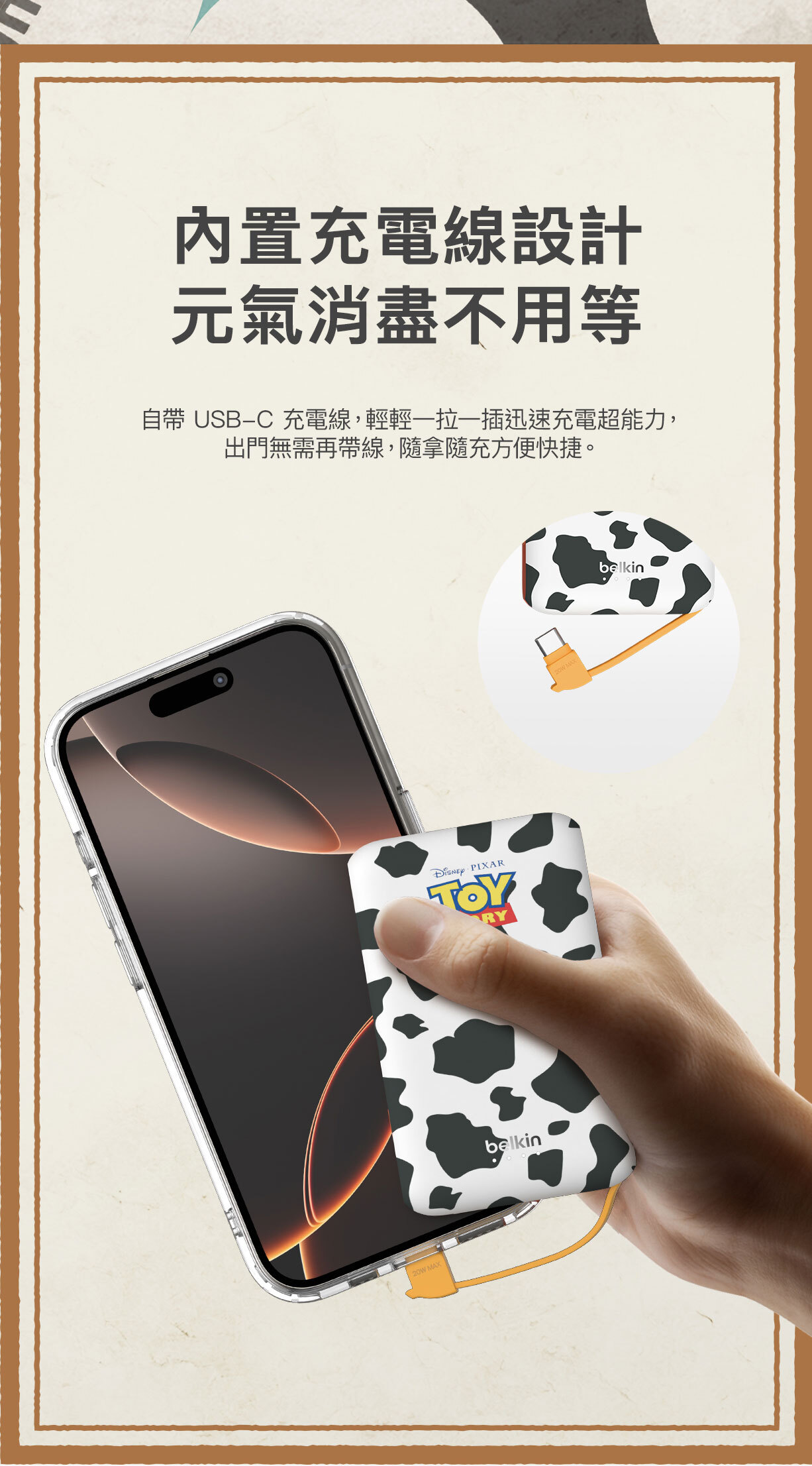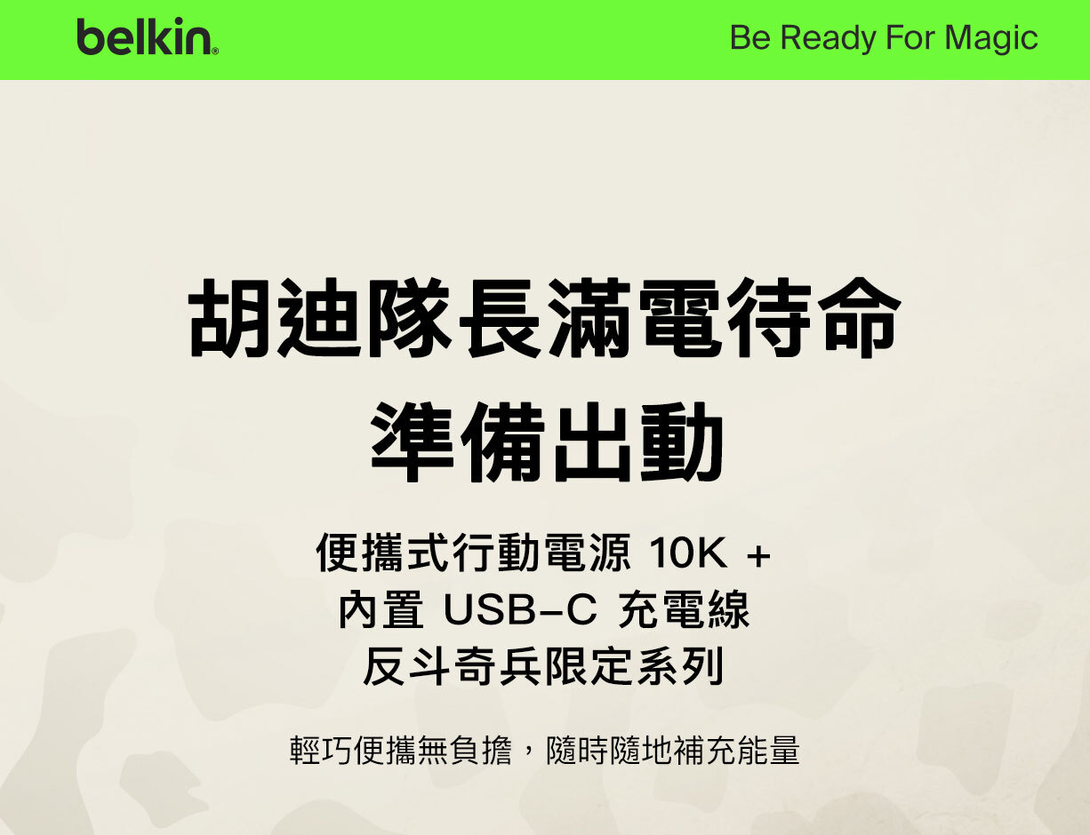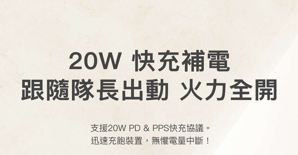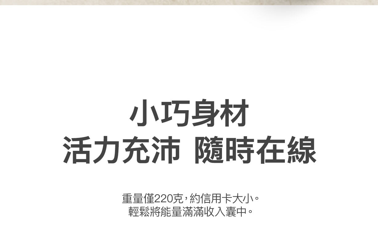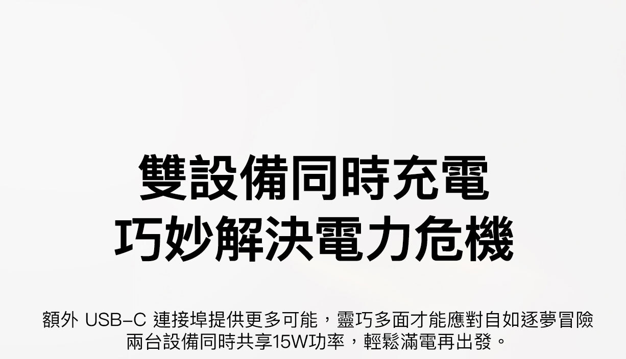 使用我們輕便的 10K§ 行動電源,充電功率可達 20W。其內置 USB-C® 充電線設計方便隨時快速充電,無需額外攜帶連接線。USB-C 端口可同時為第二部裝置充電。