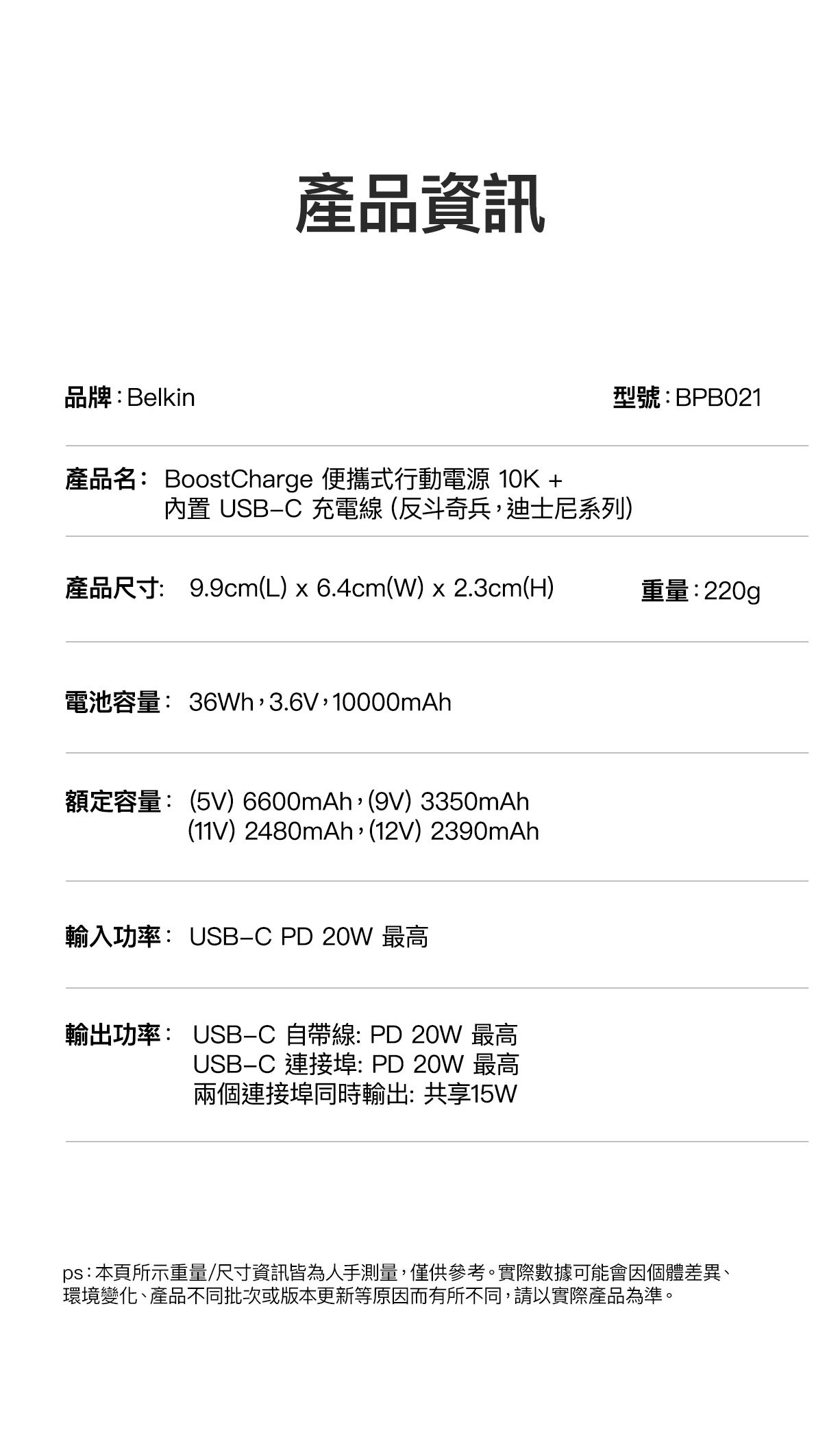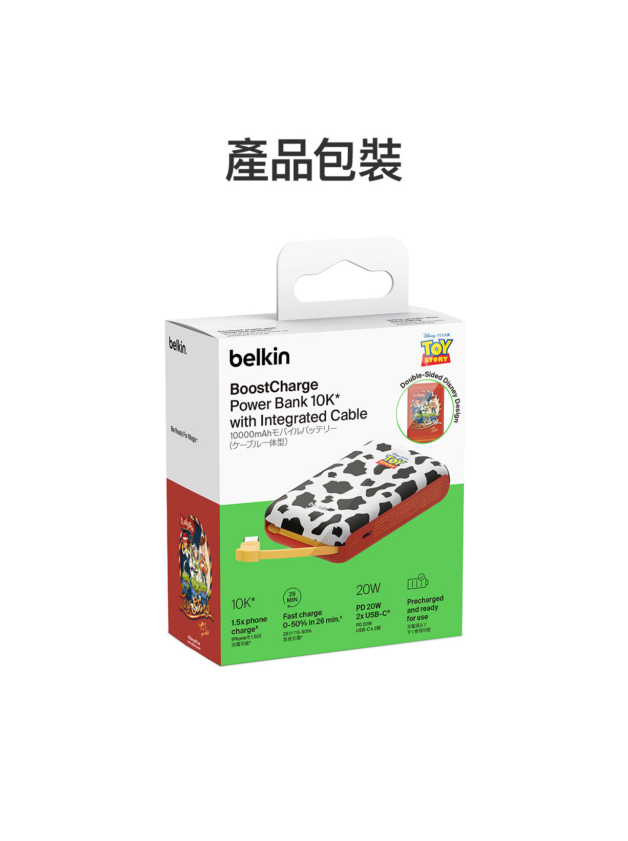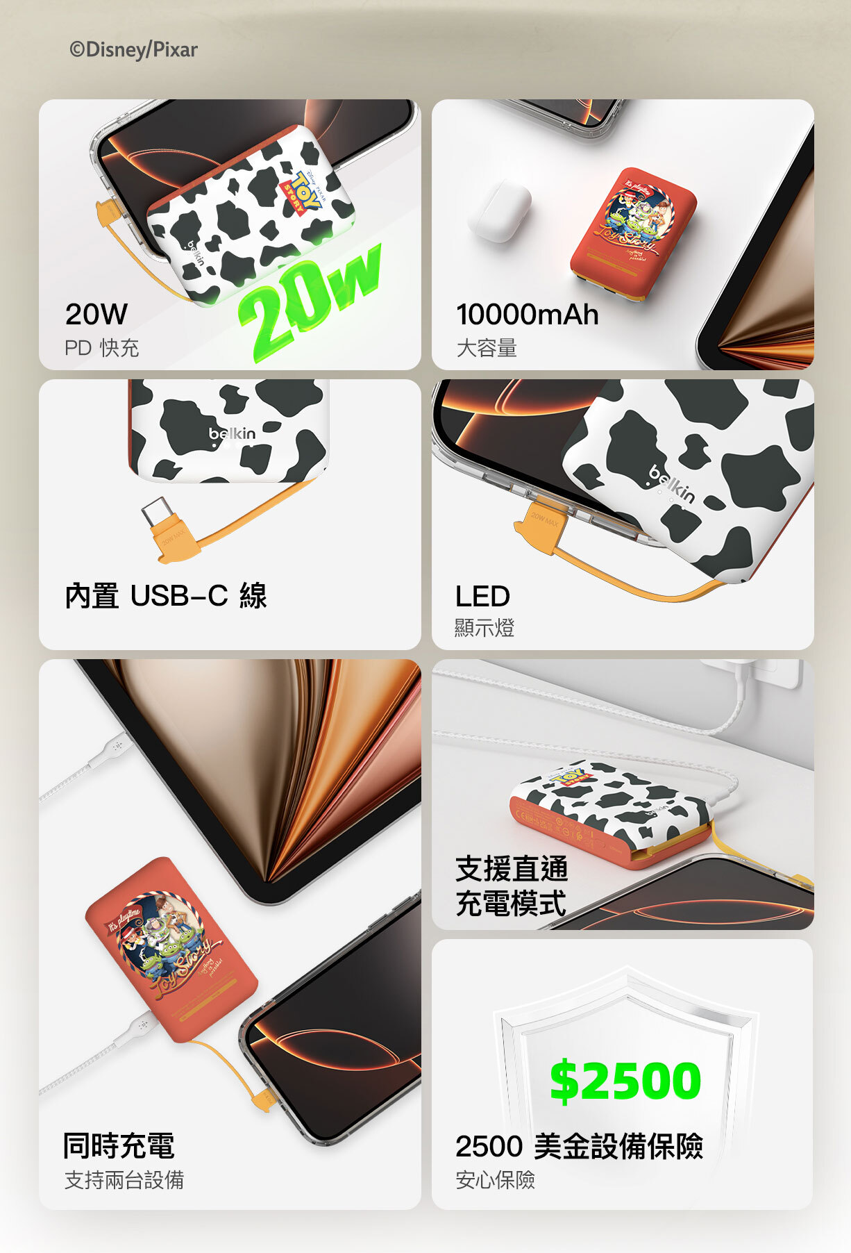 使用我們輕便的 10K§ 行動電源,充電功率可達 20W。其內置 USB-C® 充電線設計方便隨時快速充電,無需額外攜帶連接線。USB-C 端口可同時為第二部裝置充電。