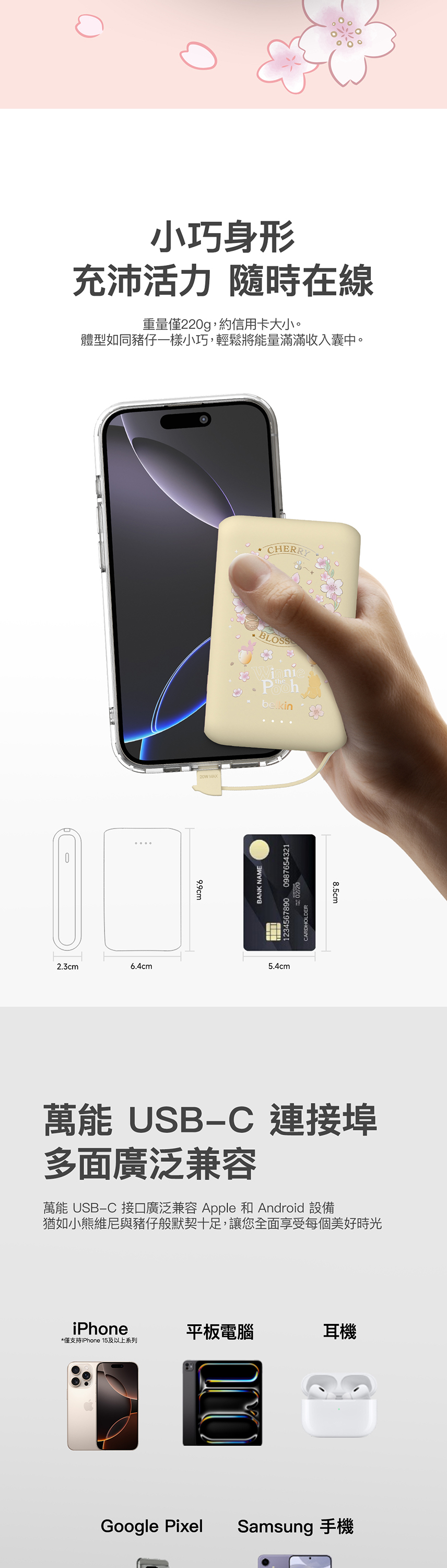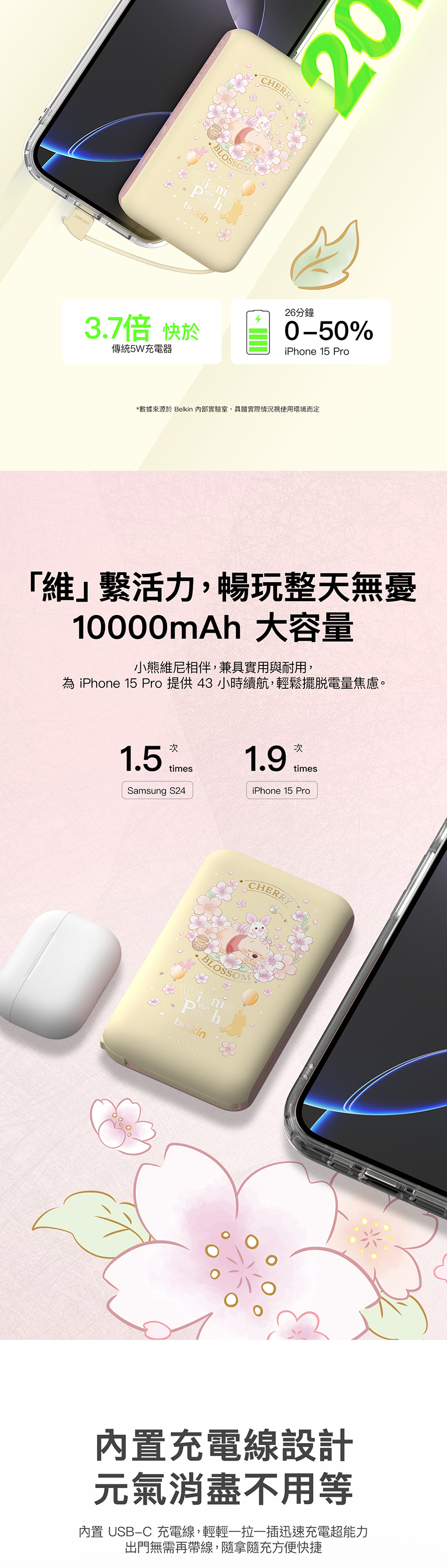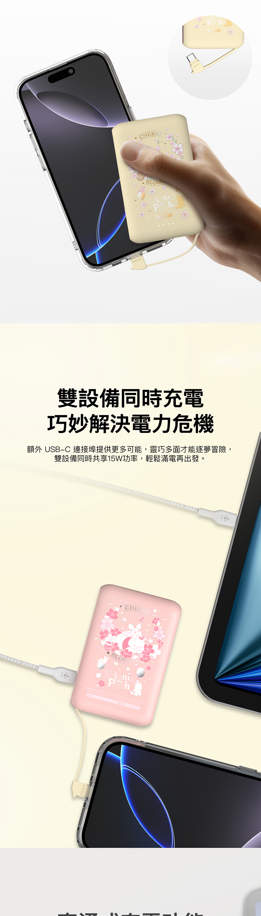 使用我們輕便的 10K§ 行動電源,充電功率可達 20W。其內置 USB-C® 充電線設計方便隨時快速充電,無需額外攜帶連接線。USB-C 端口可同時為第二部裝置充電。