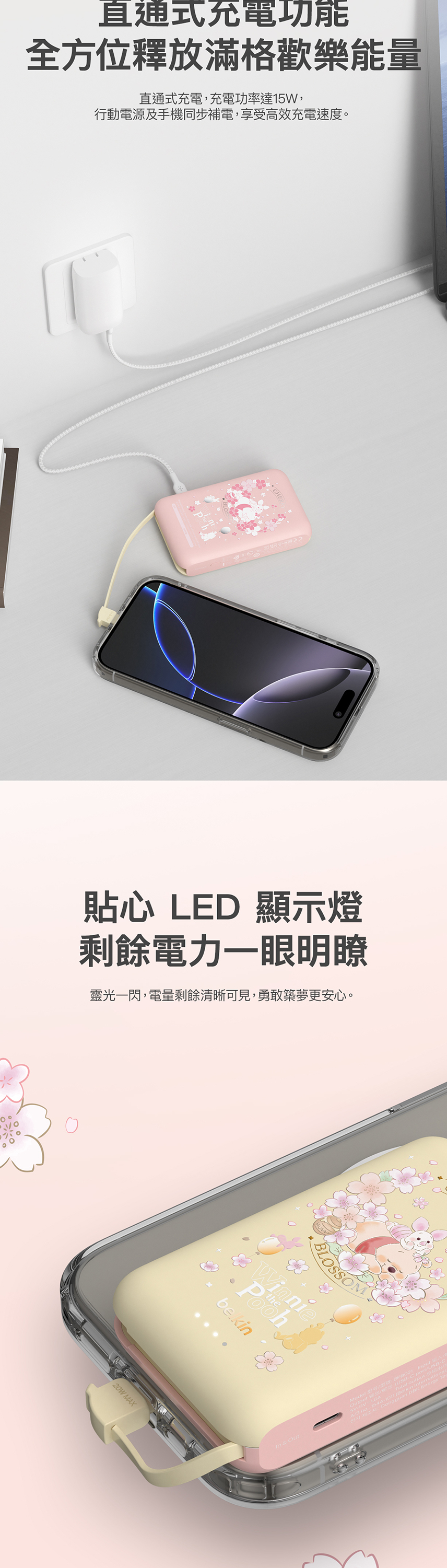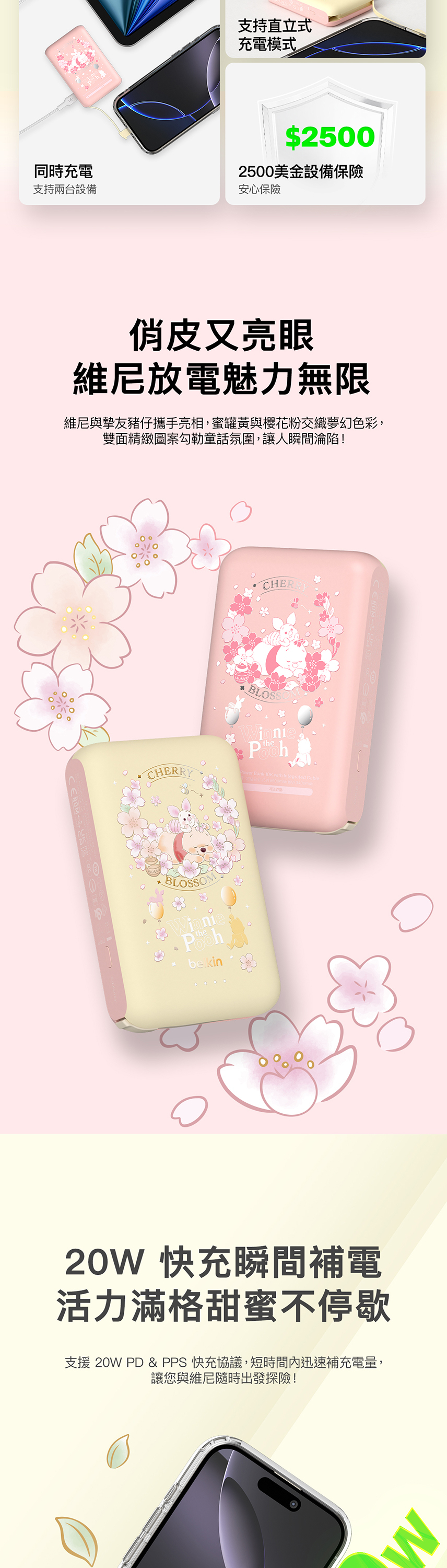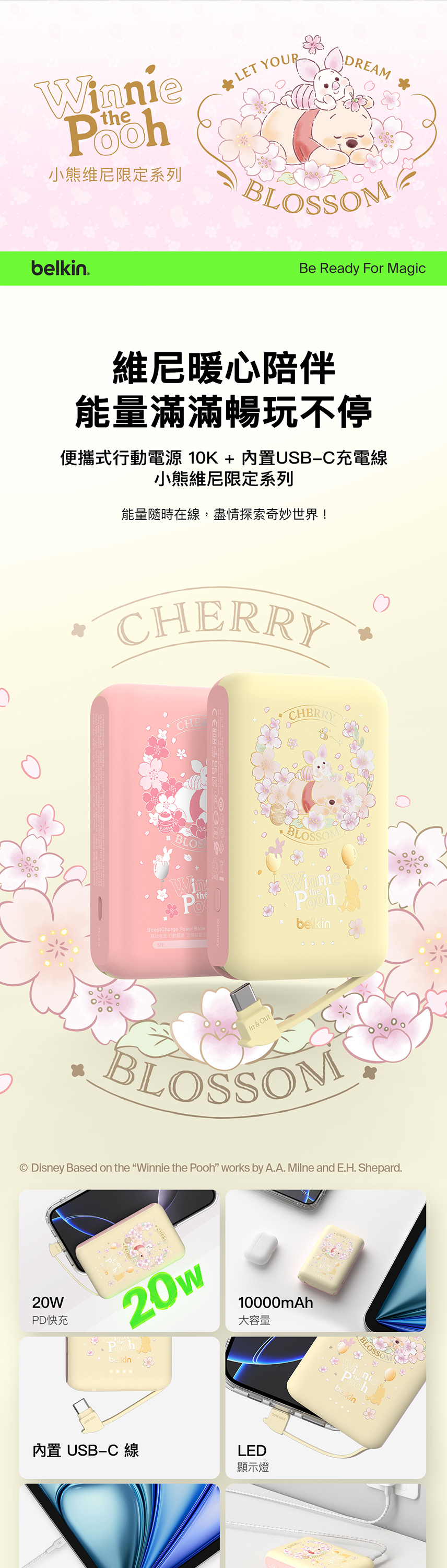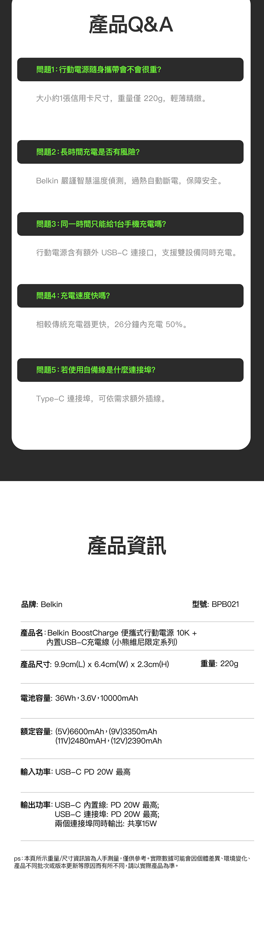使用我們輕便的 10K§ 行動電源,充電功率可達 20W。其內置 USB-C® 充電線設計方便隨時快速充電,無需額外攜帶連接線。USB-C 端口可同時為第二部裝置充電。