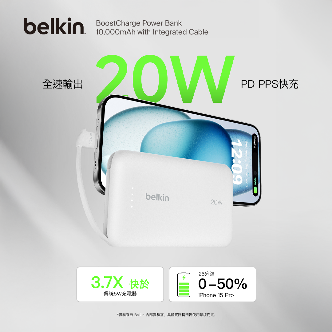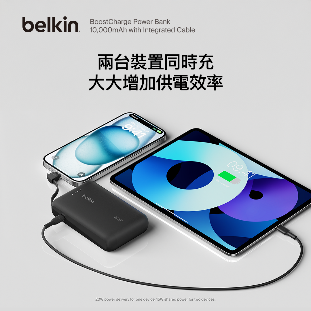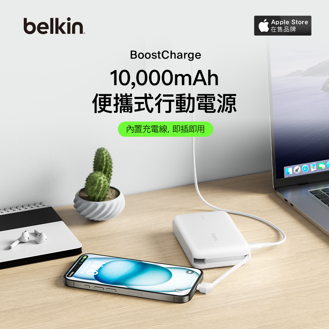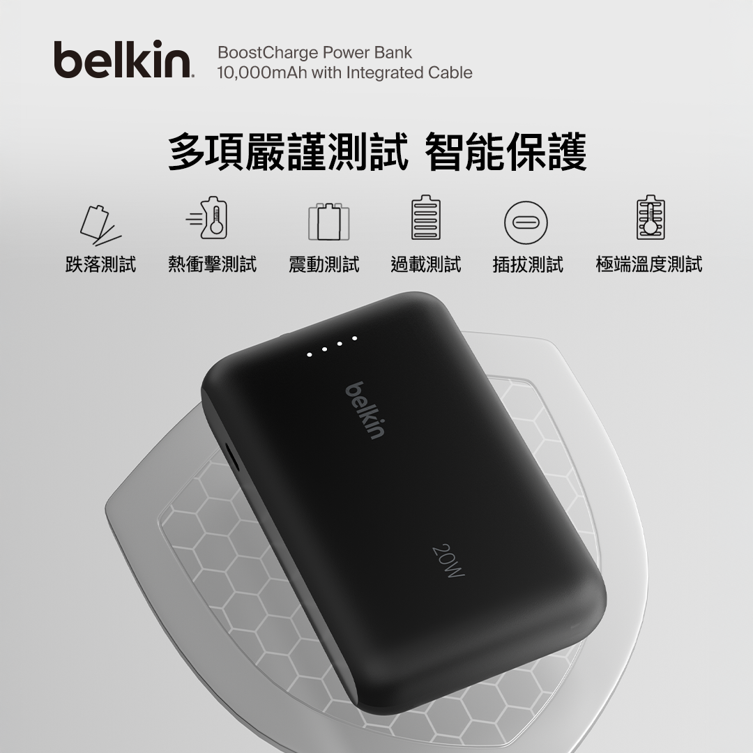 使用我們輕便的 10K§ 行動電源,充電功率可達 20W。內建 USB-C® 充電線,讓您無需額外攜帶連接線,隨時快速充電。此外,這款行動電源亦配備 USB-C 連接埠,可同時為第二部裝置充電。