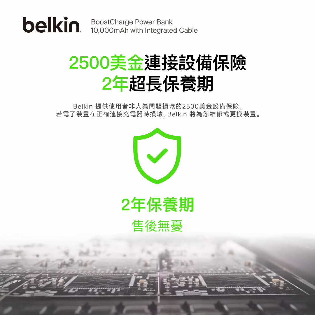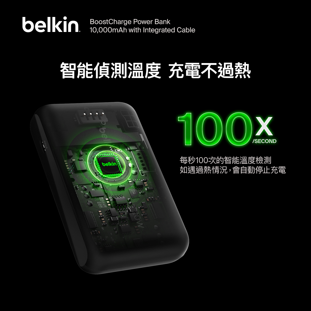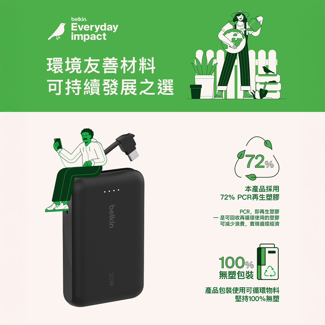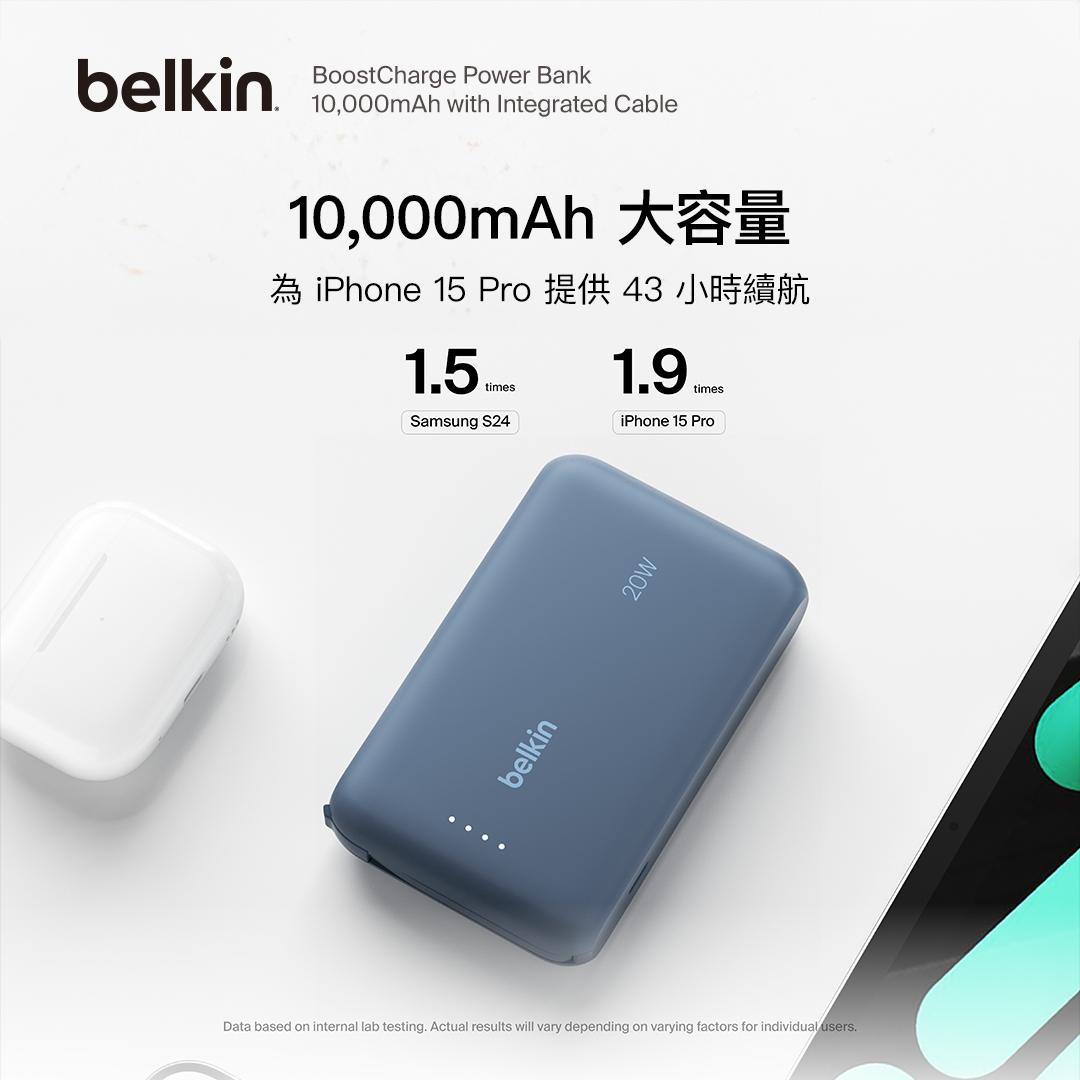 使用我們輕便的 10K§ 行動電源,充電功率可達 20W。內建 USB-C® 充電線,讓您無需額外攜帶連接線,隨時快速充電。此外,這款行動電源亦配備 USB-C 連接埠,可同時為第二部裝置充電。