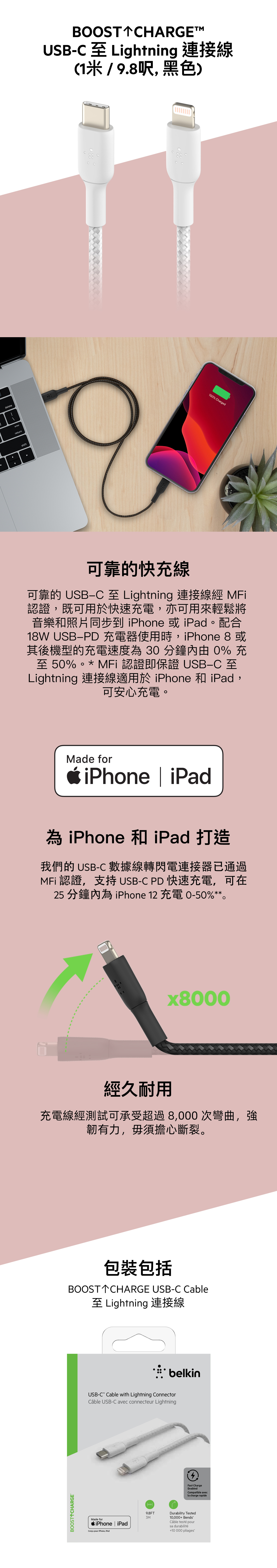 BoostCharge USB-C 至 Lightning 編織充電線支援快速充電, 配有MFi 認證,用得安心。經測試可承受 10,000 次彎曲,非常耐用。