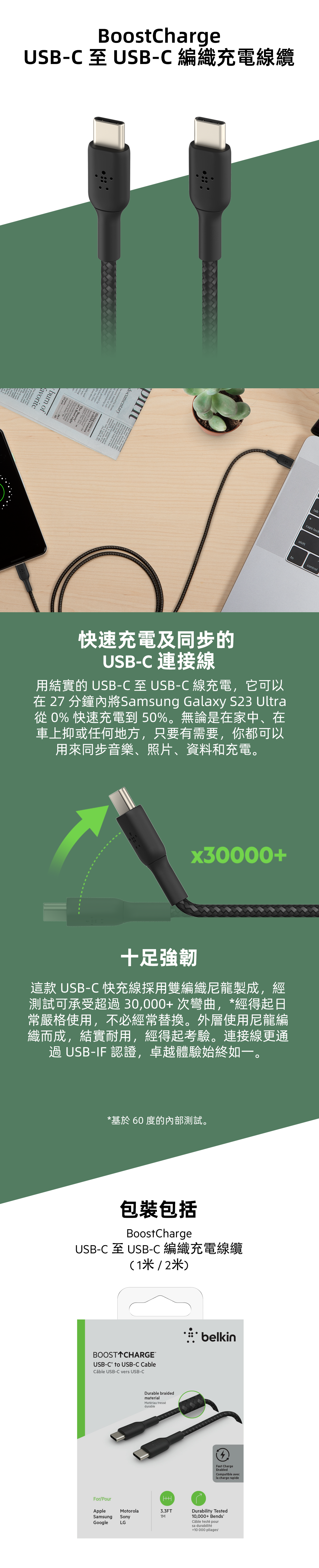 此款USB-C 至 USB-C 編織充電線讓您享受快速充電,以堅固的編織 USB-C 至 USB-C 線充電約 36 分鐘,即可達到 50% 電量。無論是在家中還是車上,抑或是需要同步音樂、照片或資料並為設備充電,於任何地方隨心使用。