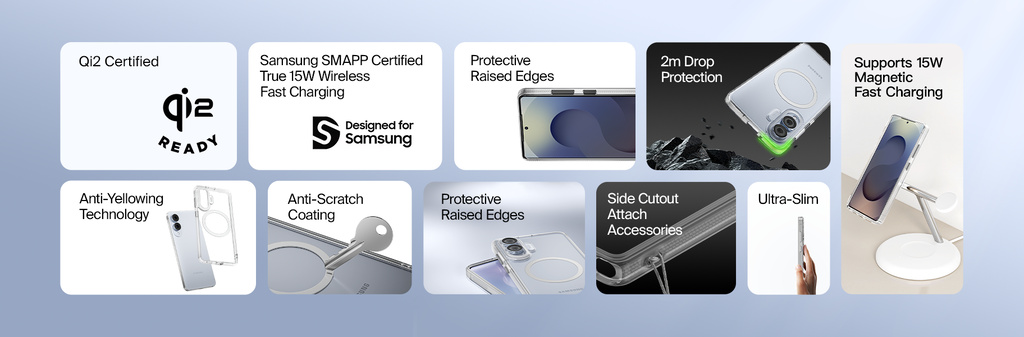 專為保護您的 Samsung Galaxy S25 而設——這款 Qi2 兼容磁吸手機殼可提供最高 2 米的防摔保護,並通過 Samsung SMAPP 認證,為 S25 系列提供 15W 無線快速充電†。此外,抗黃材料**能有效防止手機殼變色,邊框加高設計則能保護相機鏡頭和螢幕,避免手機正面朝下時刮損,全面守護您的裝置。