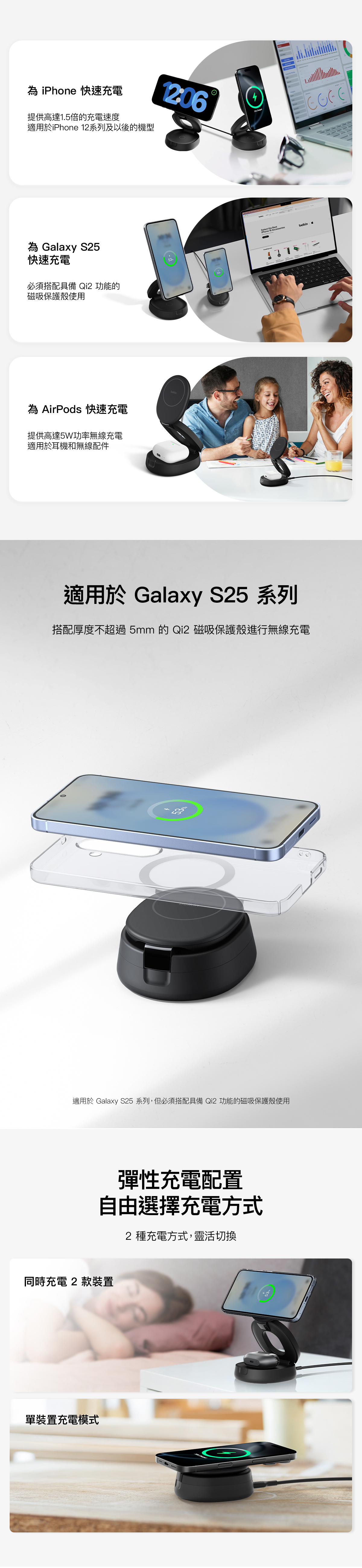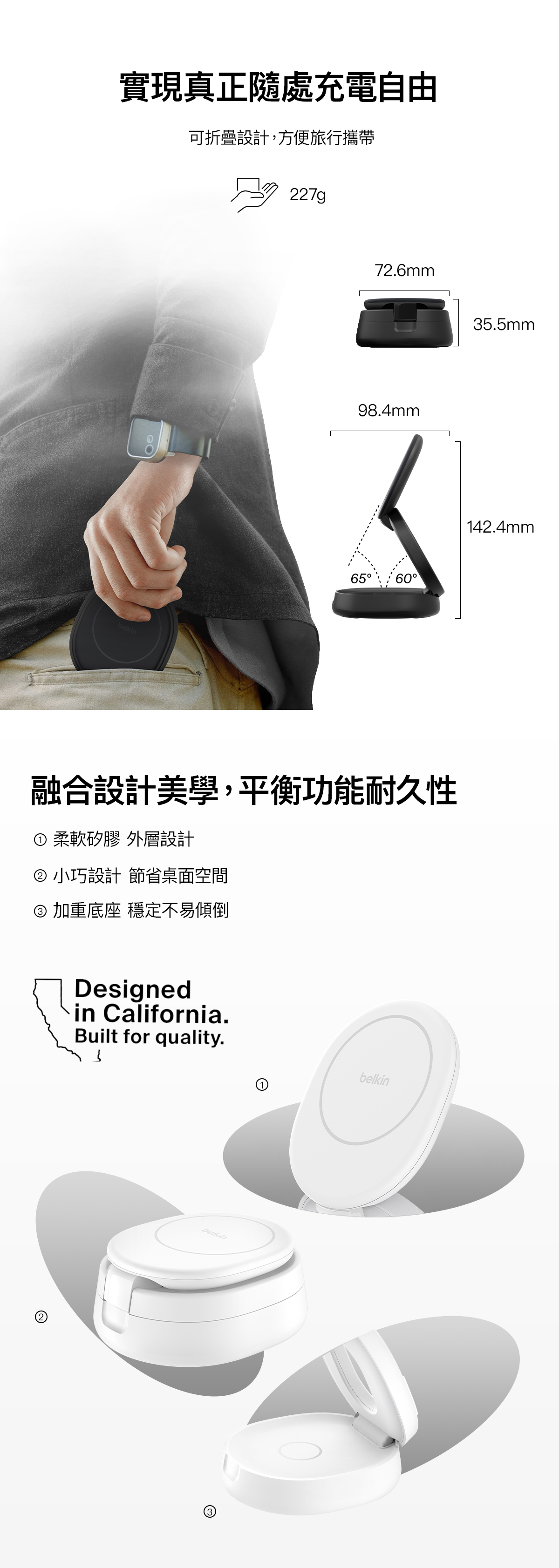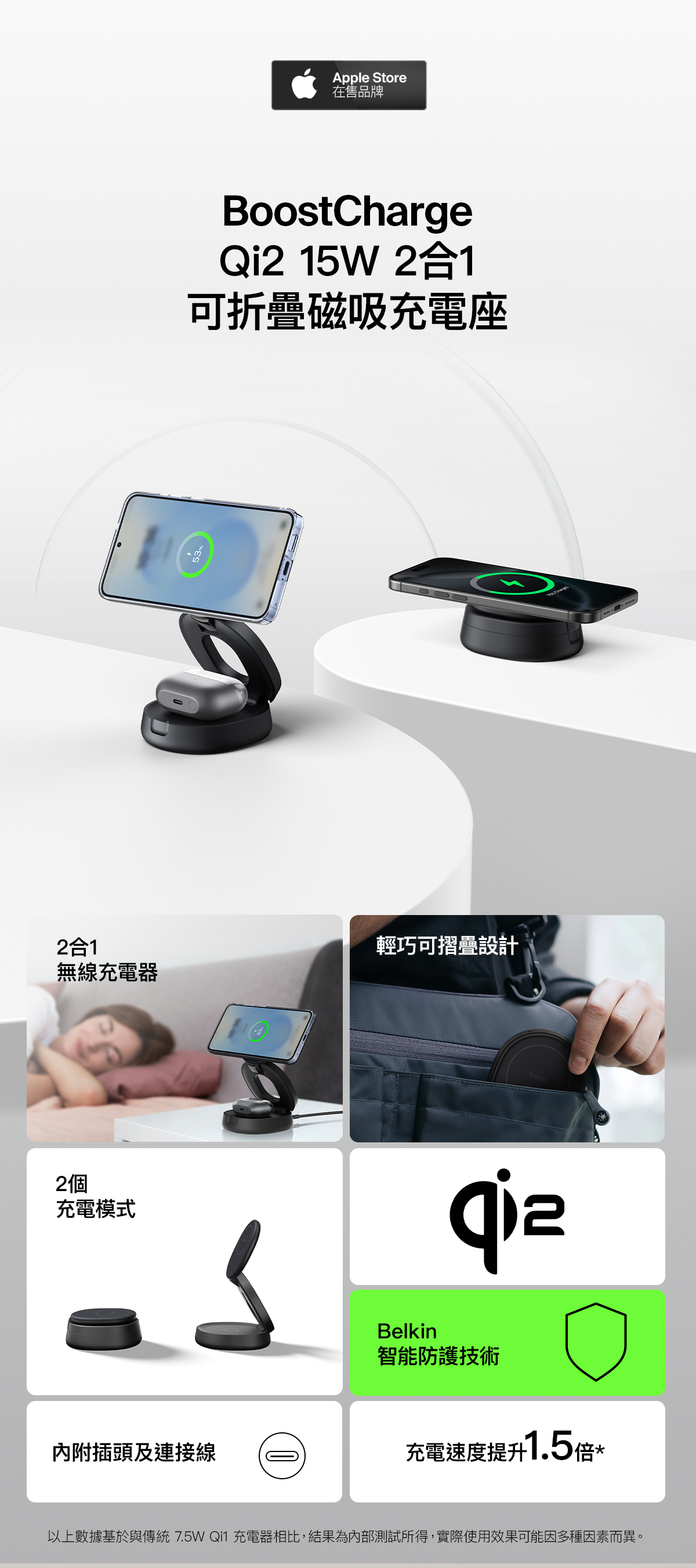 2 合 1 可轉換磁吸充電座結合了便利性與 Qi 及 MagSafe 裝置的兼容性。在橫向或縱向模式下為 iPhone 快速充電,最高可達 15W;為 AirPods 充電,最高可達 5W。其精巧的旅行適用設計,重量輕且可摺疊,配重底座可確保穩定性。
