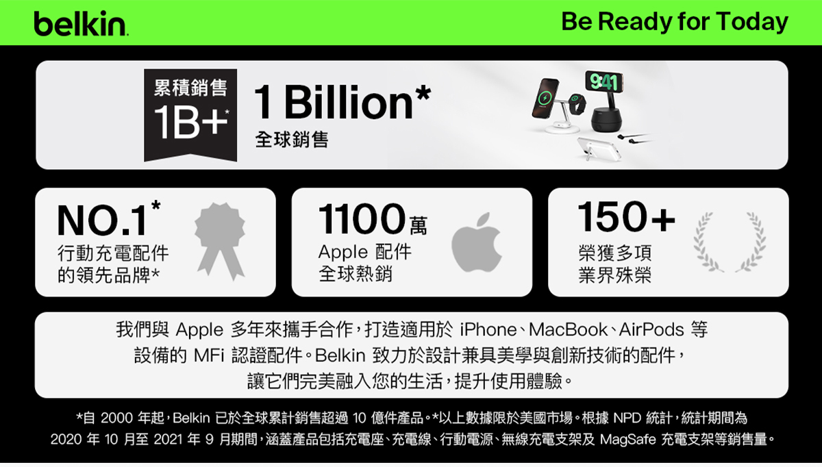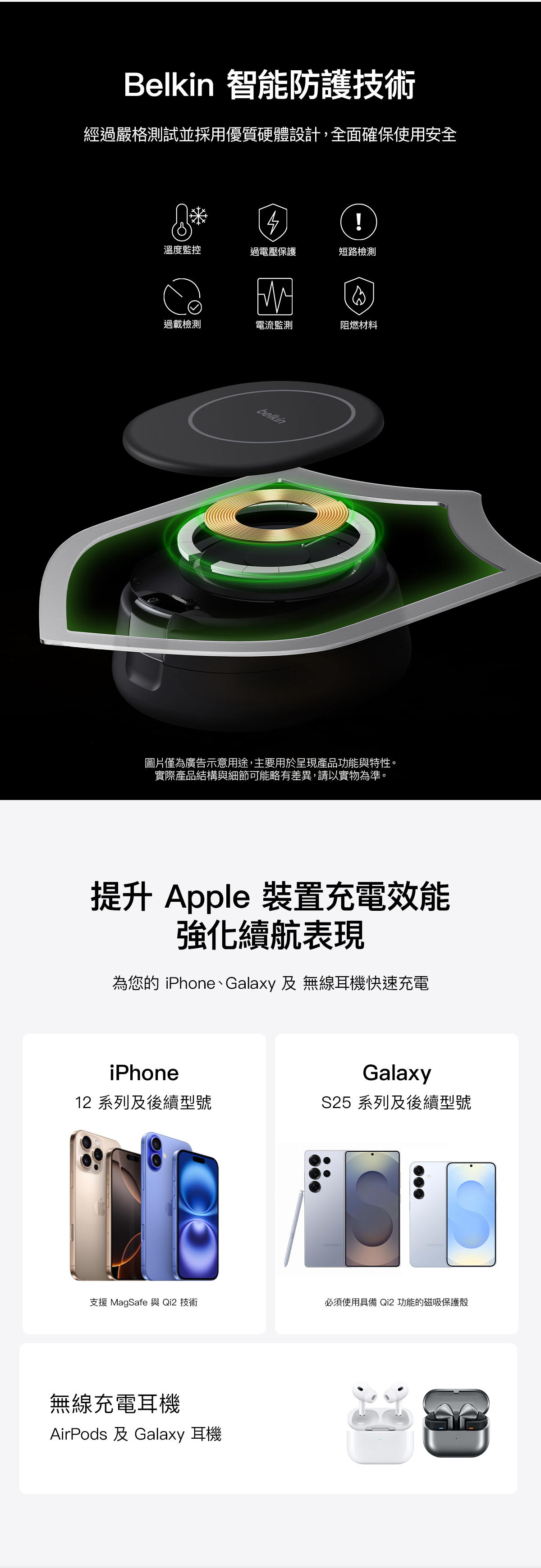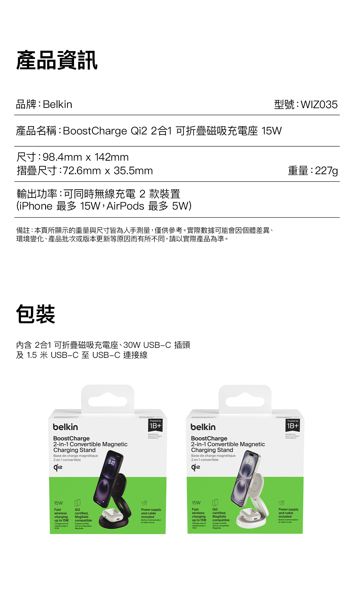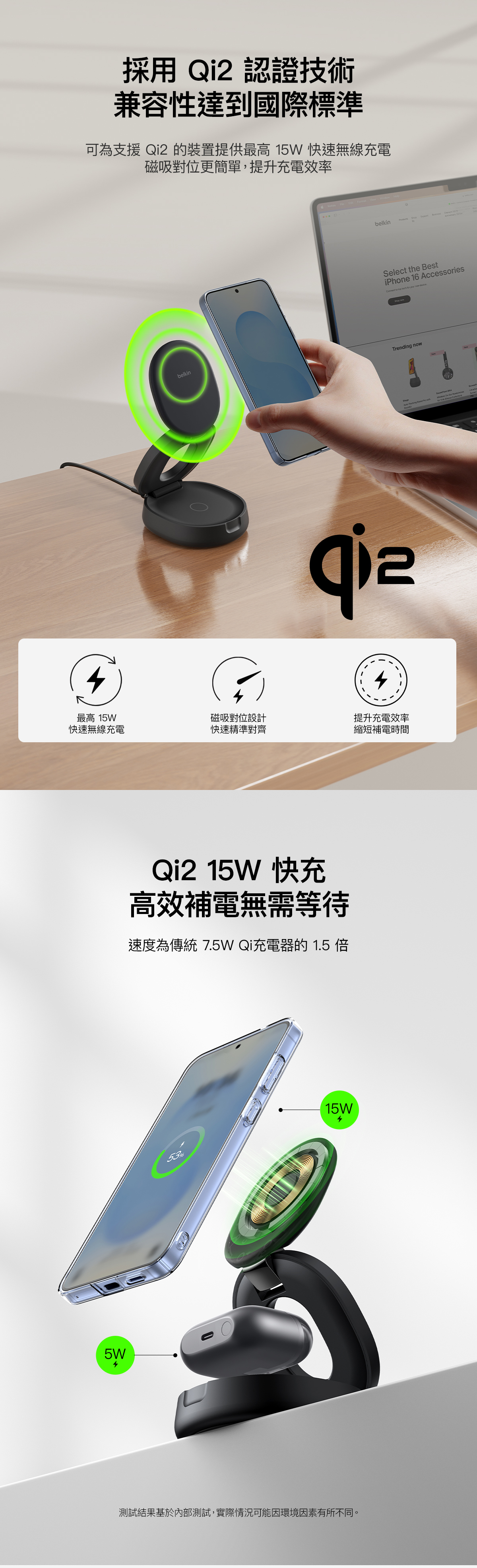 2 合 1 可轉換磁吸充電座結合了便利性與 Qi 及 MagSafe 裝置的兼容性。在橫向或縱向模式下為 iPhone 快速充電,最高可達 15W;為 AirPods 充電,最高可達 5W。其精巧的旅行適用設計,重量輕且可摺疊,配重底座可確保穩定性。