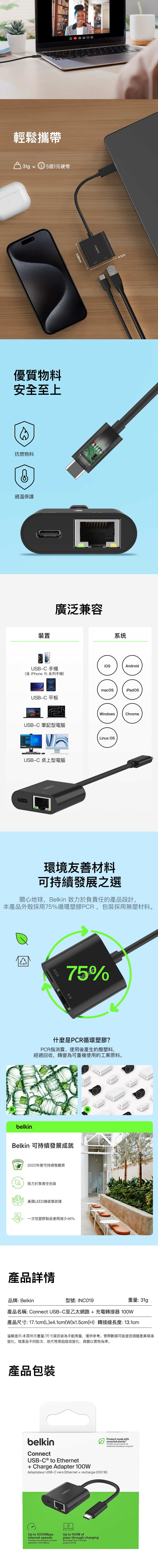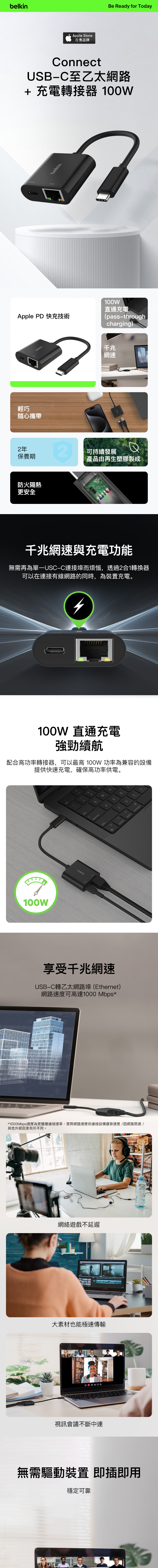使用這款緊湊型 USB-C 乙太網路轉接器能增強您的工作效能。 享受 100W USB-C 供電以及支援 10/100/1000 Mbps 的千兆位元乙太網路連接。 其輕巧的設計使其可以輕鬆地在任何地方工作,而無需使用笨重的適配器。