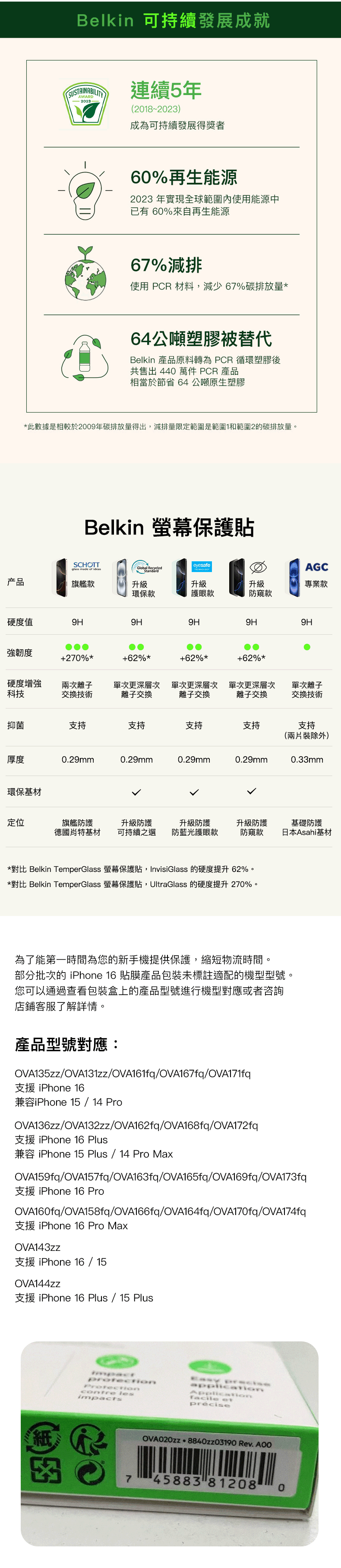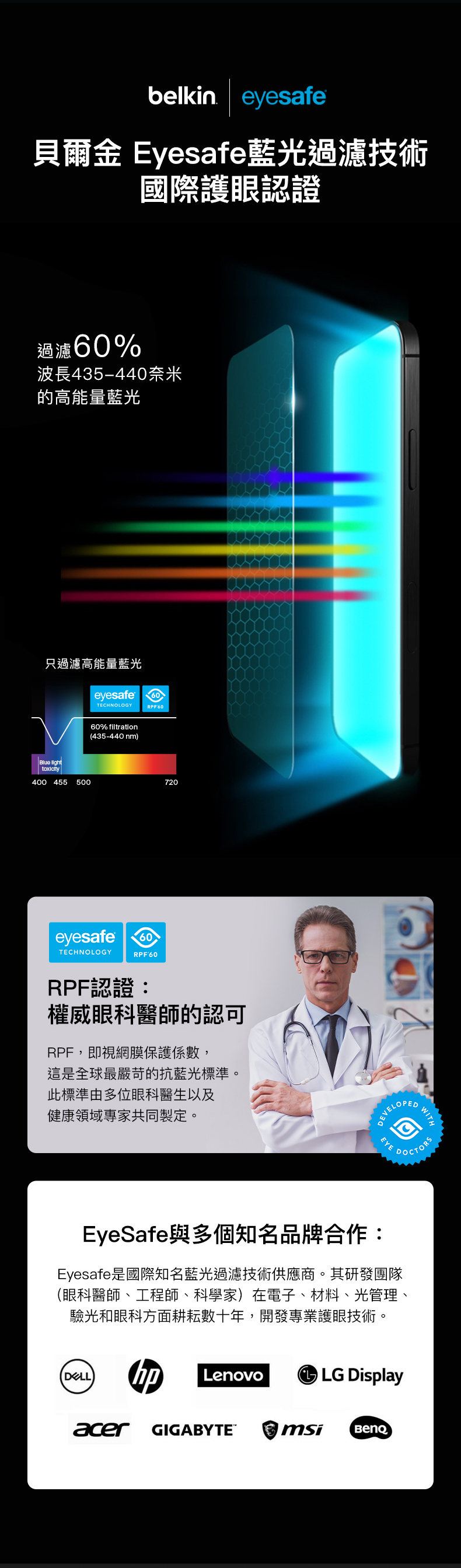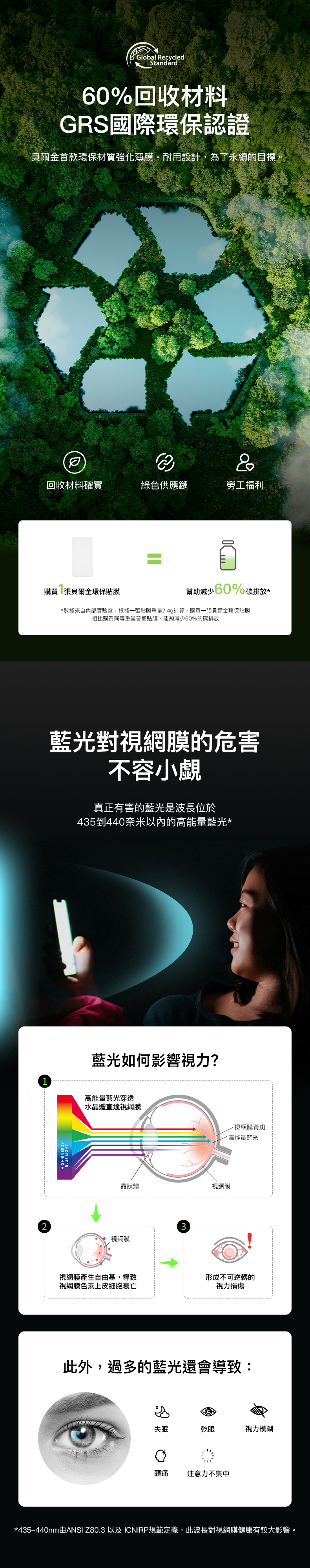 螢幕保護貼採用 Eyesafe 藍光過濾技術,以支援眼睛舒適度和睡眠品質。 InvisiGlass 的強度比強化玻璃高達 62%,其外觀和感覺與原廠螢幕完全一樣,並能防止撞擊、刮傷、裂縫、污跡、指紋等。它由 60% 的後工業回收 (PIR) 材料製成,讓原本會被丟棄的玻璃獲得新生,不會造成浪費。